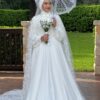 Special Details: Intricate all-over lace embroidery, elegant covered buttons, structured bodice for perfect support, matching long veil for a harmonious finish