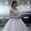 Cut: High-neck – Long sleeves – Full A-line skirt with chapel train