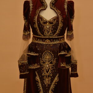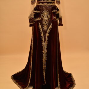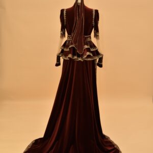 Asena Kaftan is a two-piece Turkish ceremonial set consisting of a mermaid-cut inner dress and a structured velvet jacket worn over it. The inner dress is made from rich burgundy velvet and follows the body closely through the torso and hips before opening into a floor-sweeping train. The jacket sits over the inner dress with puffed shoulders and sheer embellished sleeves — the sleeves are made from a lighter fabric than the jacket body, which creates a contrast between the solid velvet structure at the shoulders and the more open, detailed sleeve panels. Gold embroidery and hand-set crystals run across the jacket surface, concentrated around the high keyhole neckline and continuing down to the scalloped hem in a consistent thread-work pattern.
