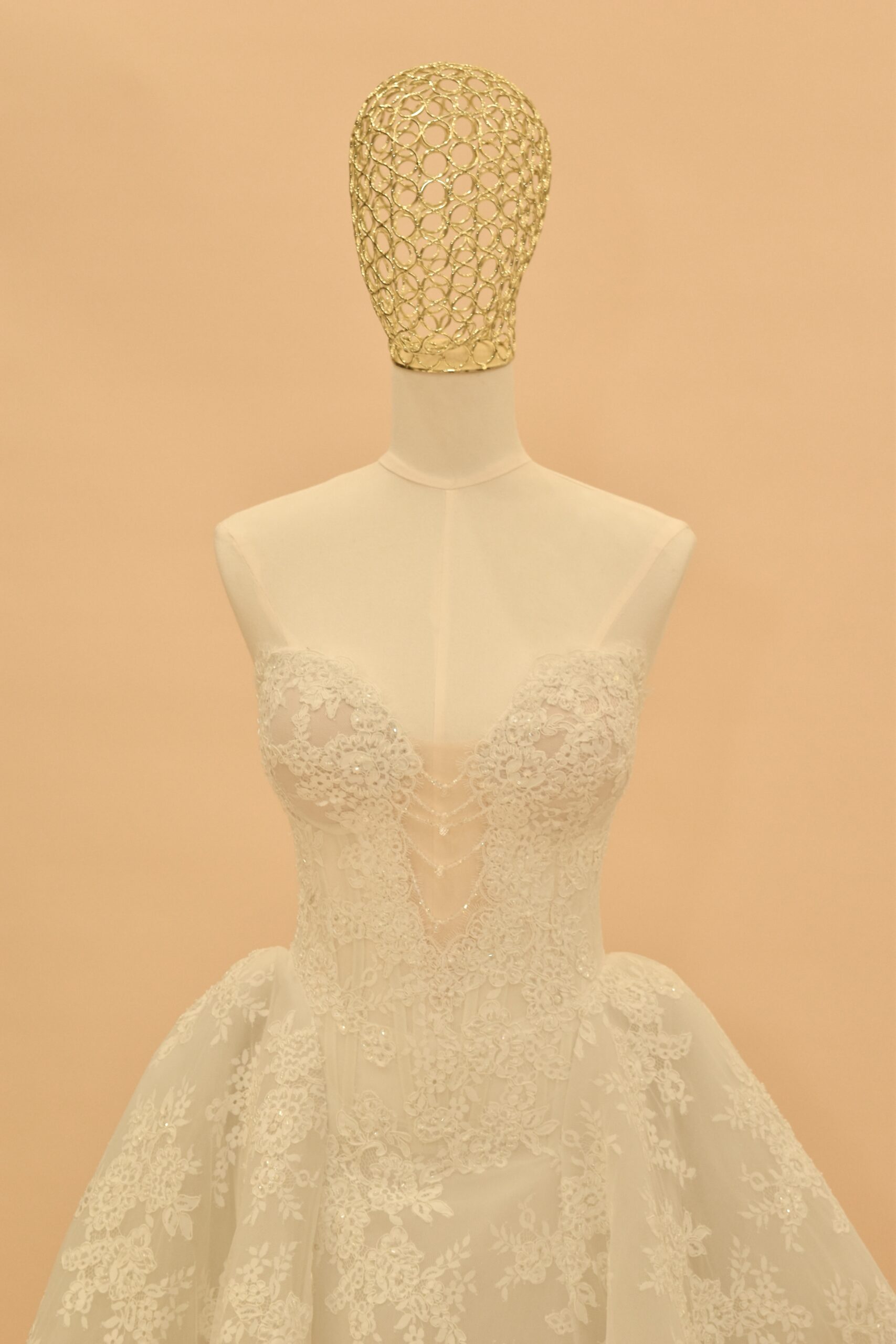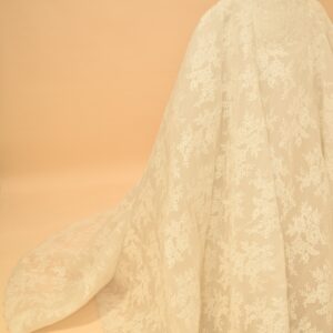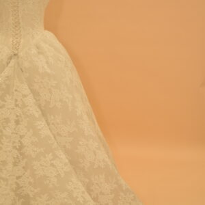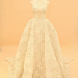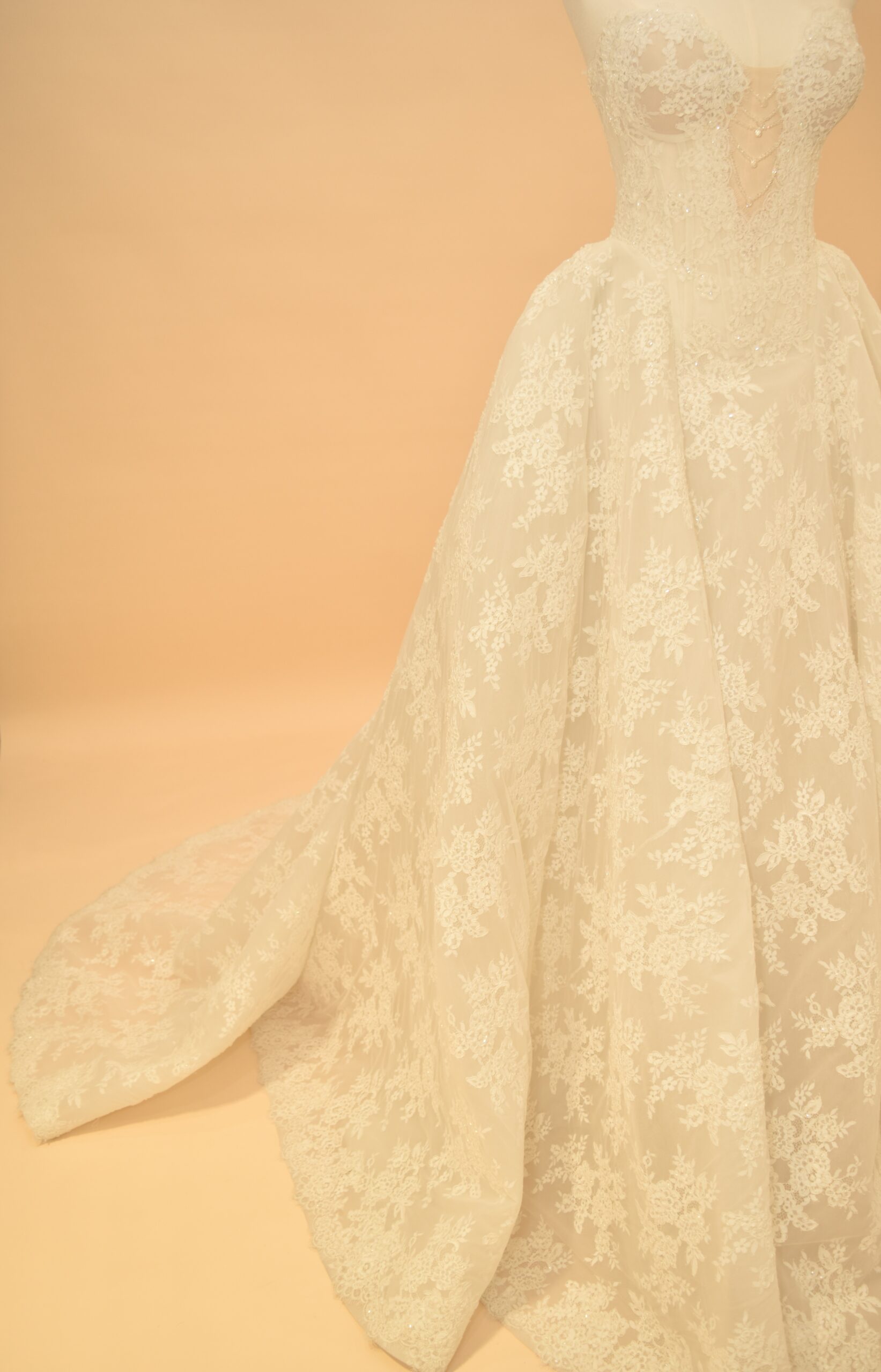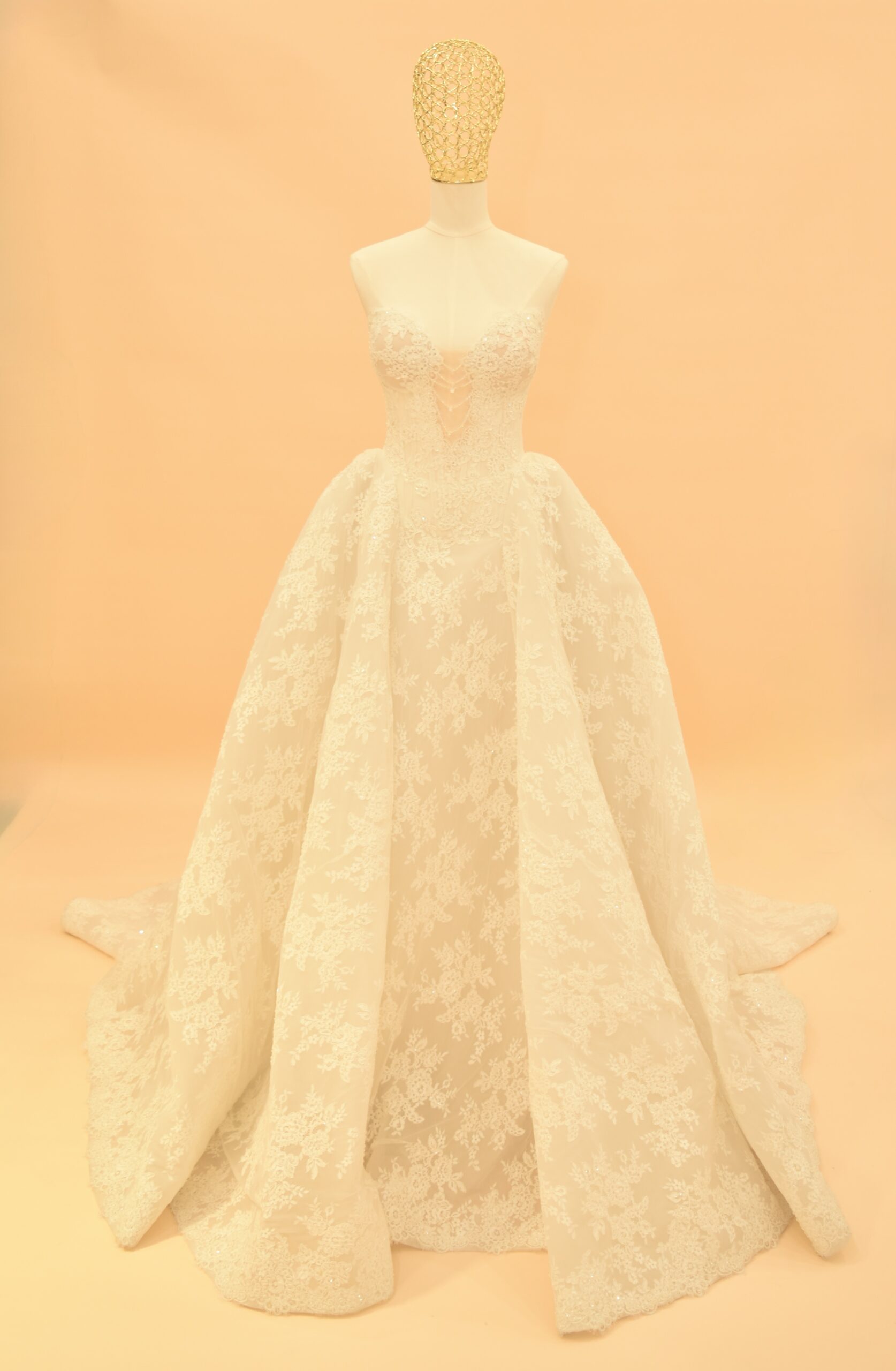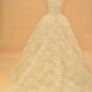 Aurora is a full ballgown with a sweetheart neckline and a plunging illusion panel that extends the neckline downward while keeping the bodice fully structured underneath. The illusion section is made from sheer French lace, so the plunge reads as open from a distance but remains covered — a detail that works well for brides who want the visual impact of a low neckline with the security of full coverage. The bodice is shaped to hold its form throughout the day and flows directly into a voluminous skirt covered in floral lace motifs. The skirt transitions into an integrated cathedral-length train – attached rather than detachable – which means the full silhouette from bodice to train reads as one continuous line.