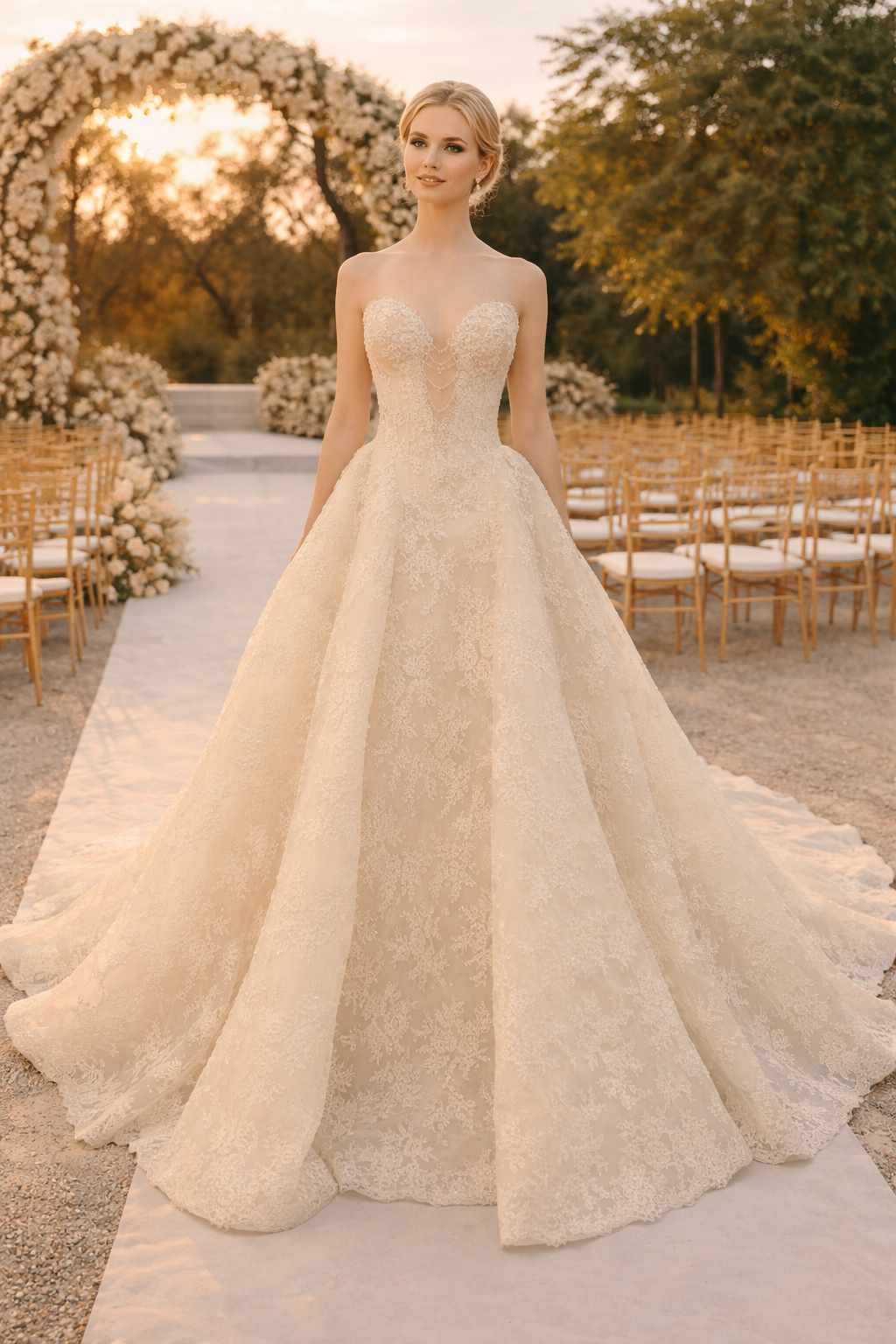 If you are comparing sweetheart ballgowns with floral lace, take a look at the Ivory Sweetheart Floral Lace Ball Gown for a different take on the same neckline and silhouette family. The Eternal Bloom Couture Wedding Gown is another full ballgown worth considering. To see Aurora in person, book your private bridal appointment at our Sugar Land, TX boutique – we serve brides from Houston, Katy, Richmond, and Fort Bend County, with video consultations available for out-of-town clients.