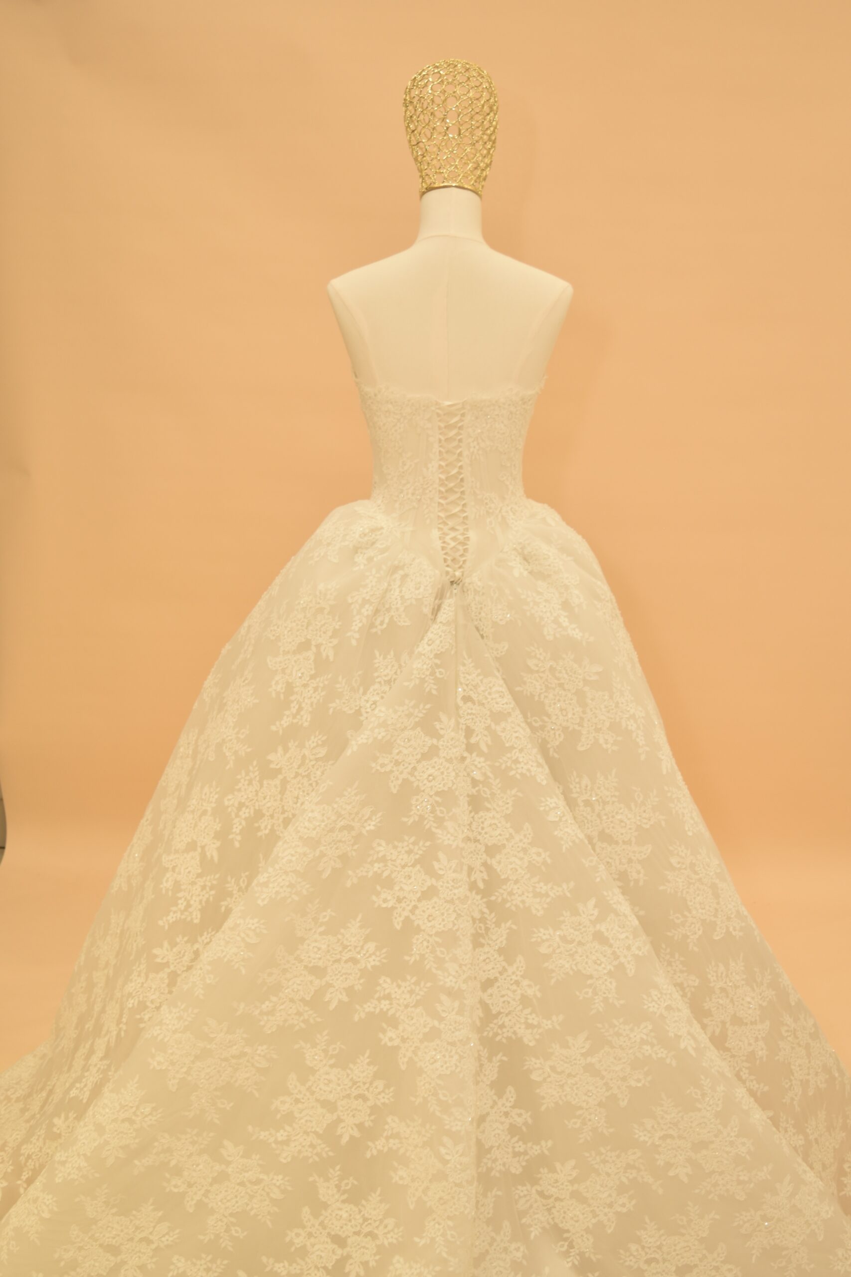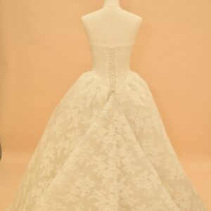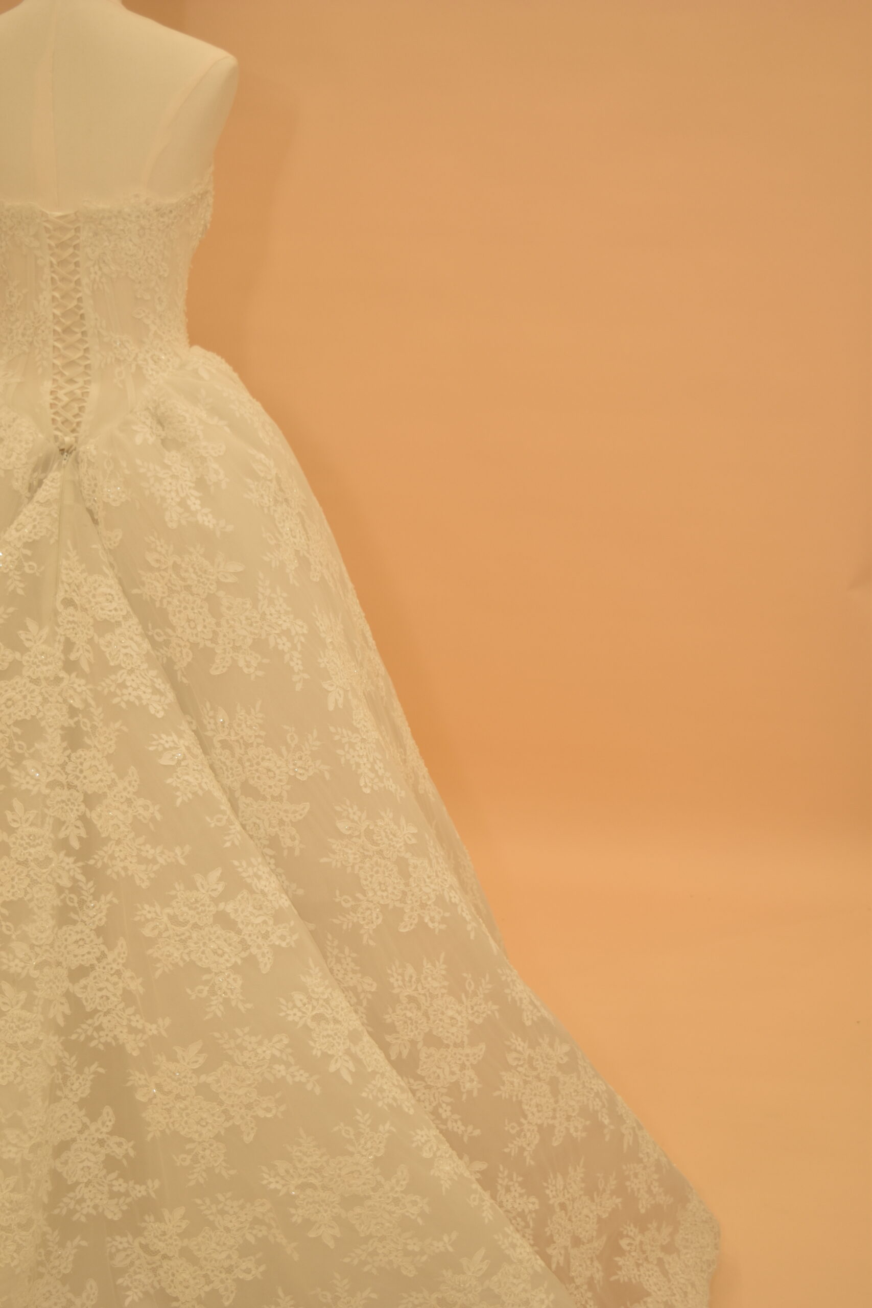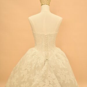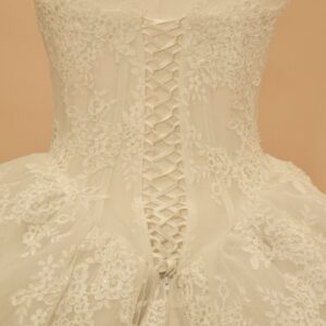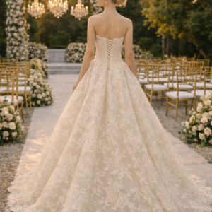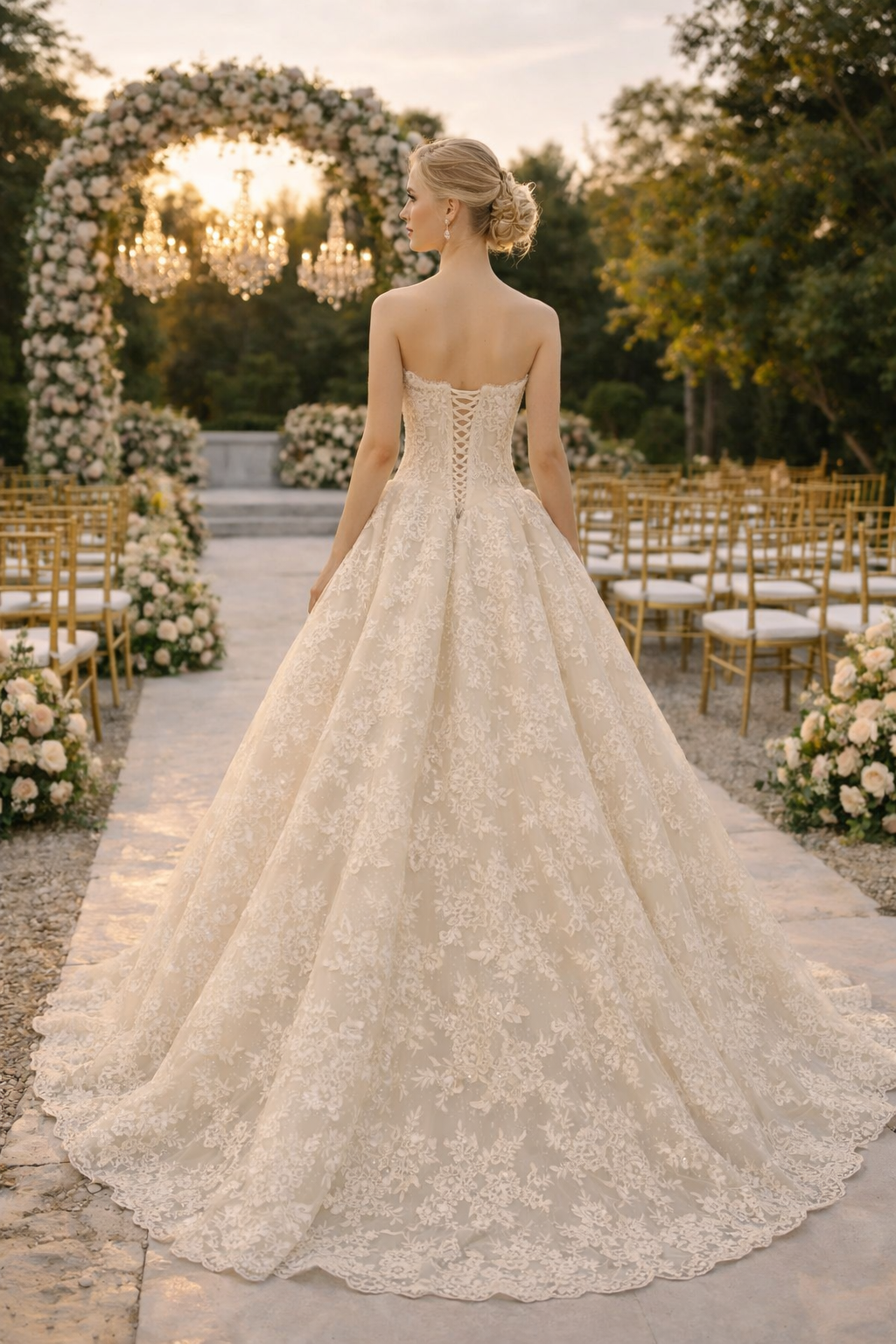 The back closes with a traditional adjustable lace-up corset that runs the full length of the bodice. This closure type allows the fit to be tightened or loosened on the day, which is useful for events where you may be wearing the gown for an extended period. The fabric combines layers of premium French lace with soft tulle underneath, giving the skirt its volume without excessive weight. Subtle sparkling accents are woven into the lace, and the floral appliques are hand-stitched individually at key points across the bodice and skirt before the gown leaves the studio.
