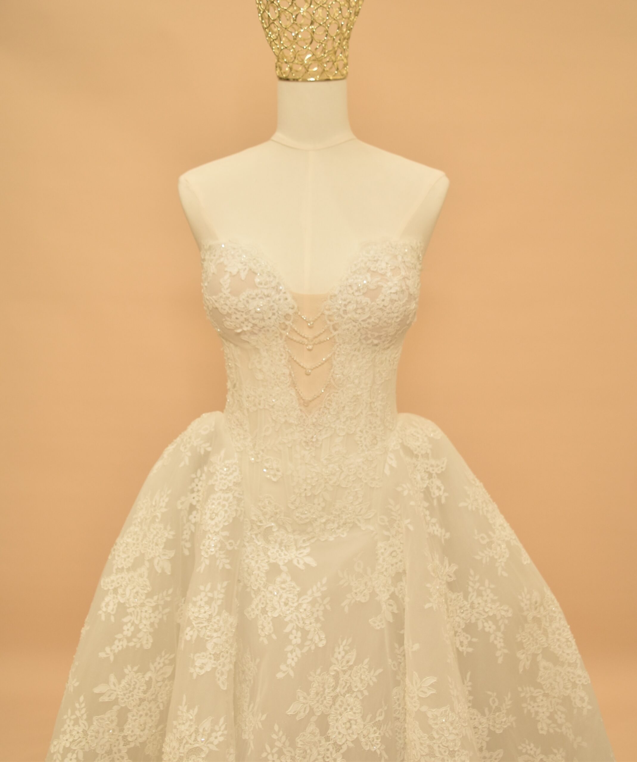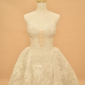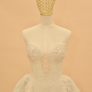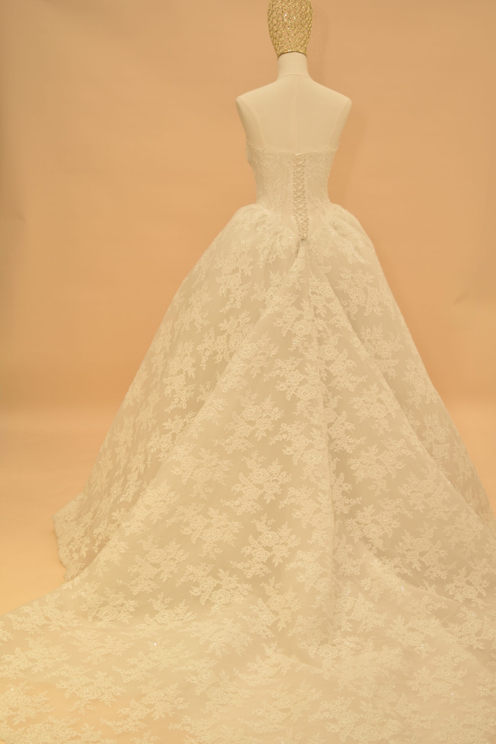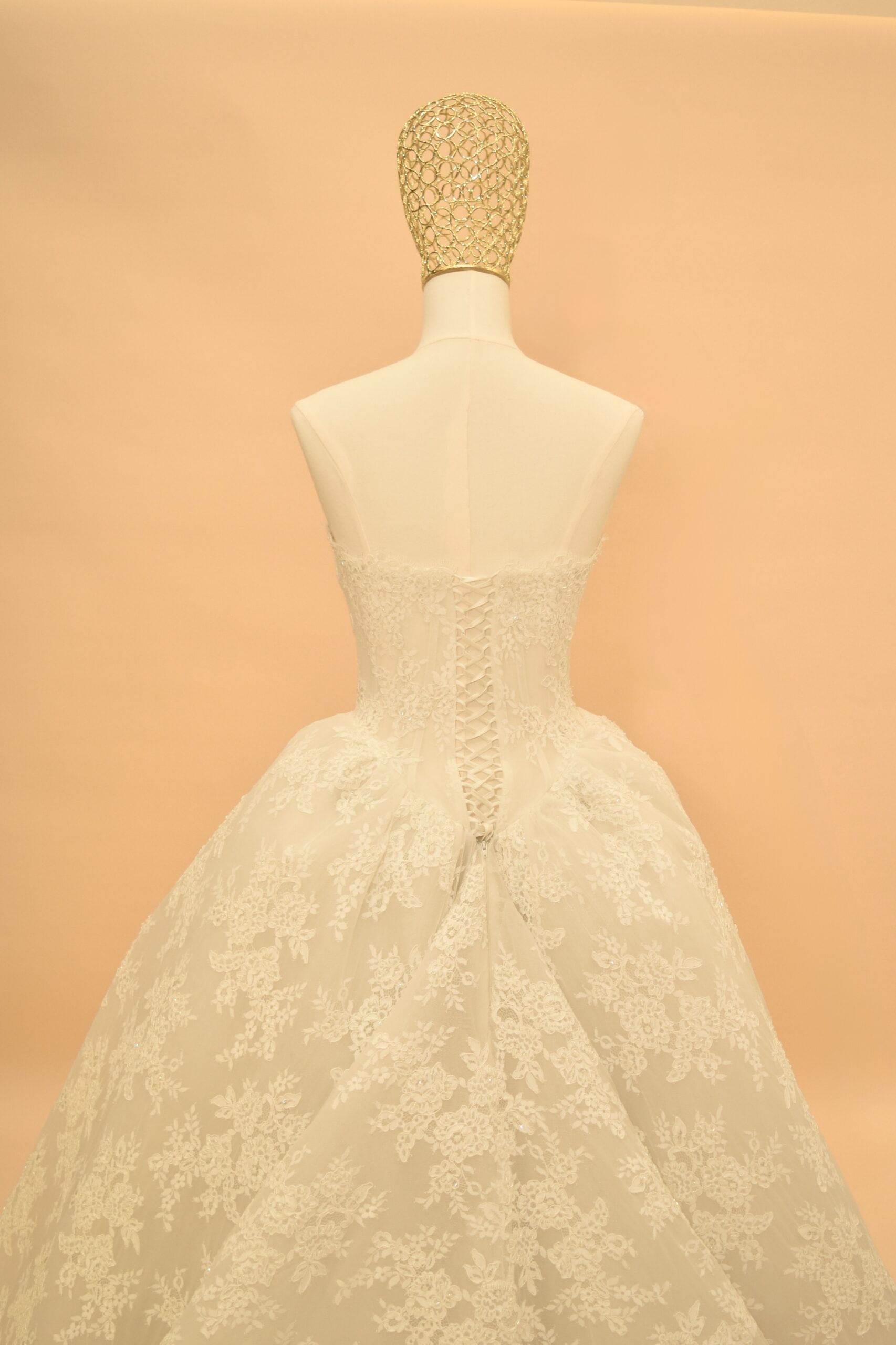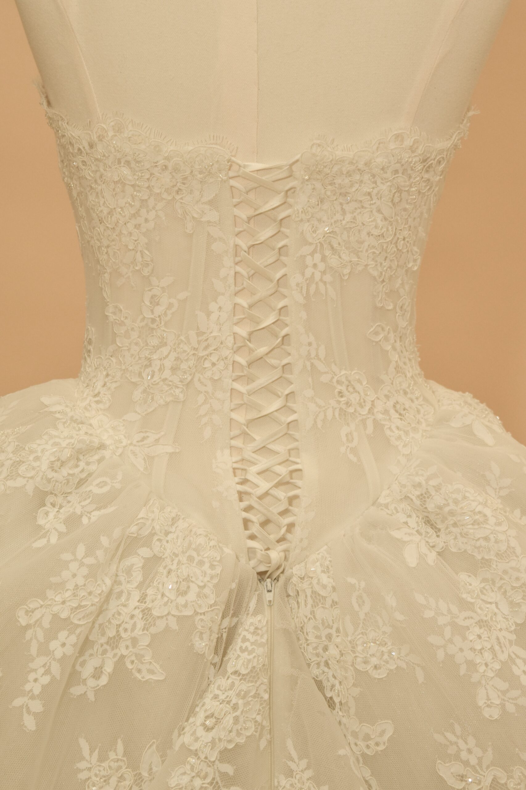The back closes with a traditional adjustable lace-up corset that runs the full length of the bodice. This closure type allows the fit to be tightened or loosened on the day, which is useful for events where you may be wearing the gown for an extended period. The fabric combines layers of premium French lace with soft tulle underneath, giving the skirt its volume without excessive weight. Subtle sparkling accents are woven into the lace, and the floral appliques are hand-stitched individually at key points across the bodice and skirt before the gown leaves the studio.