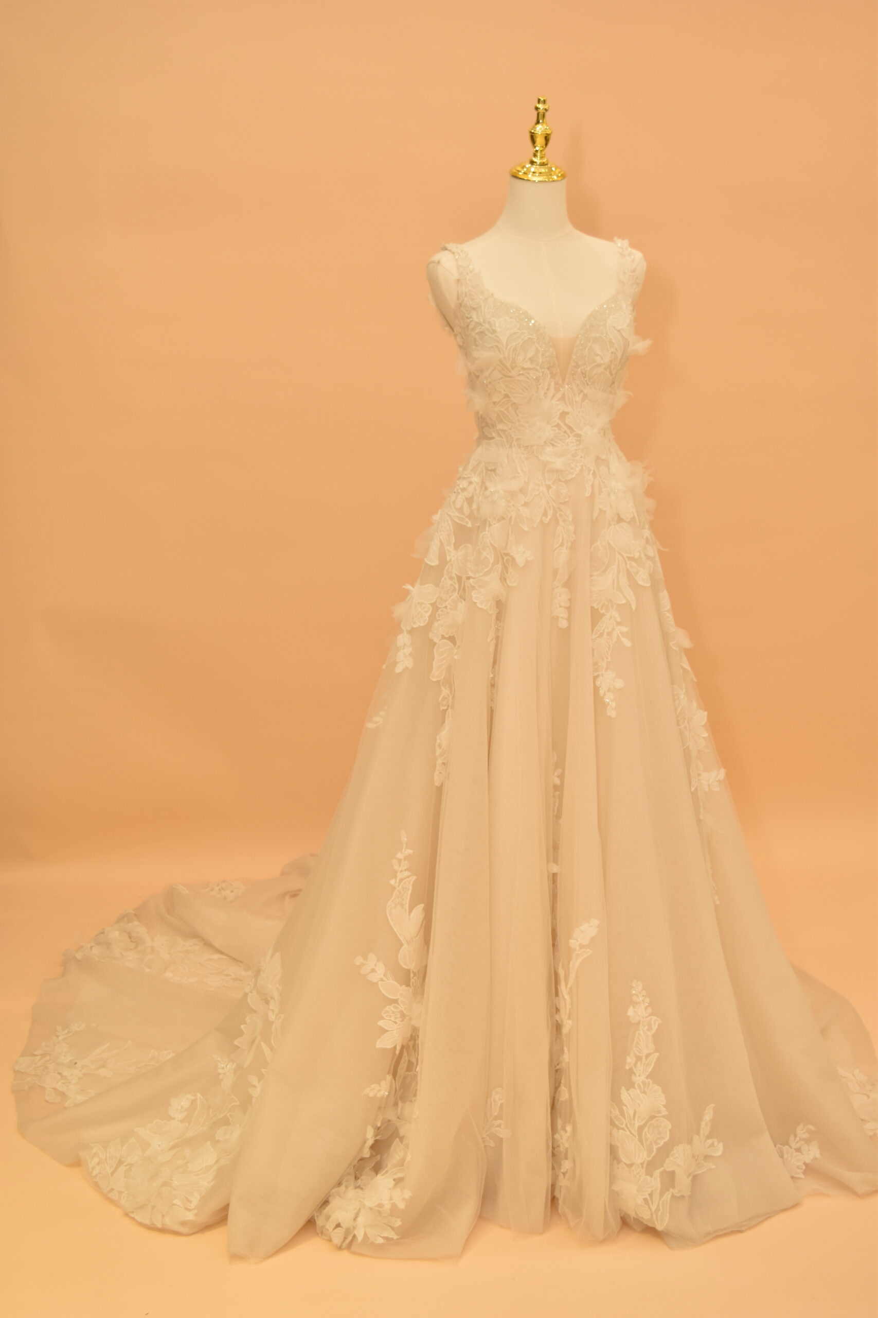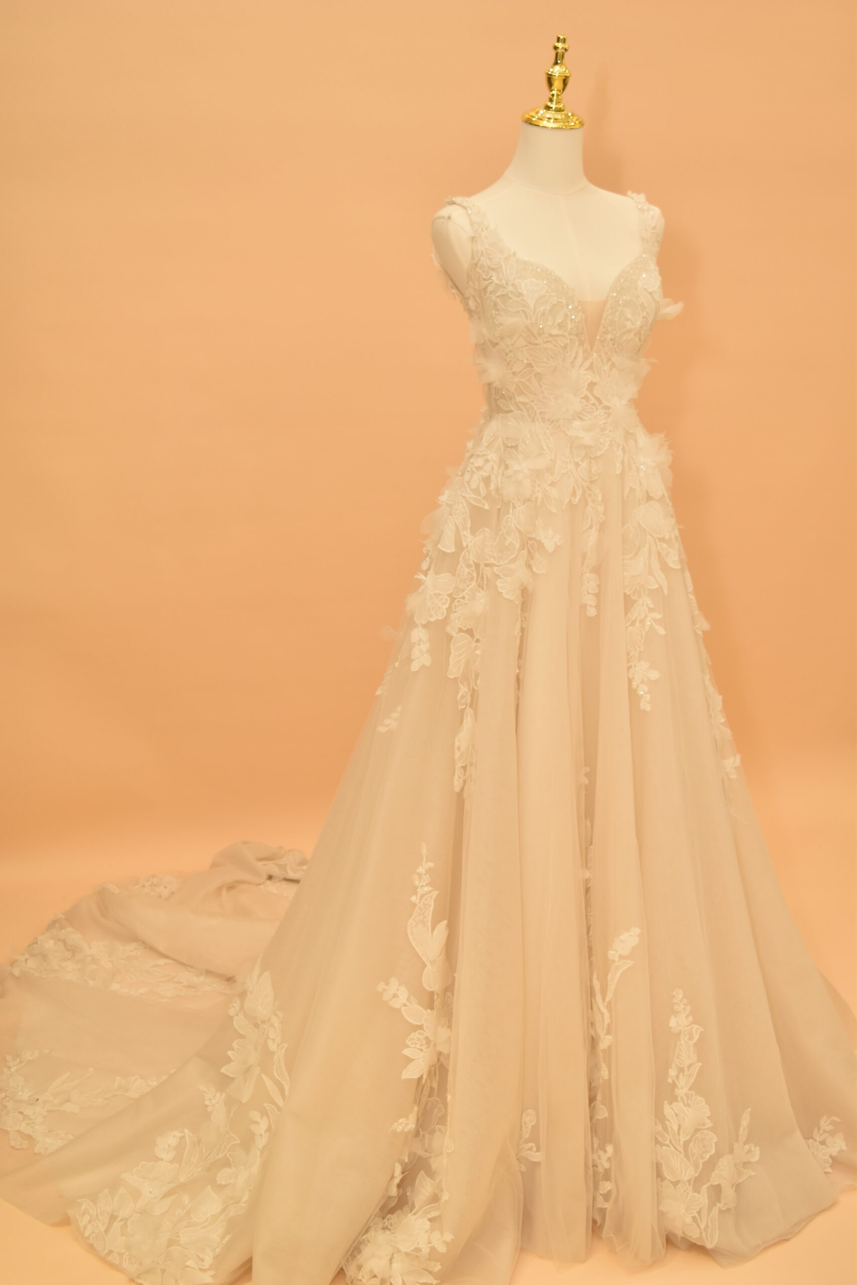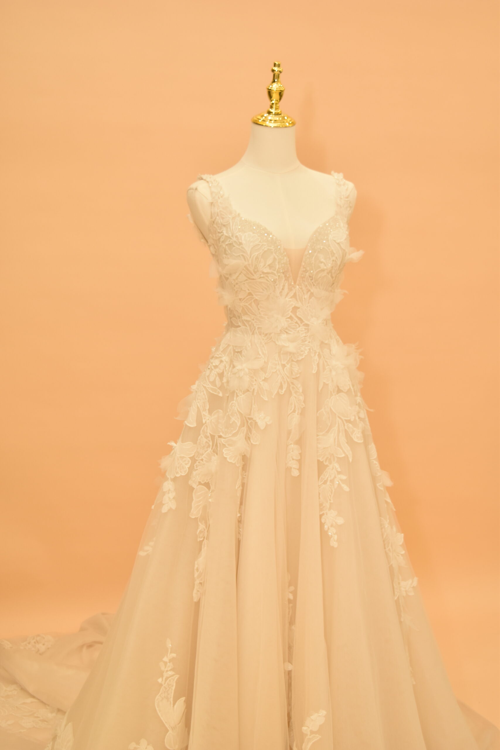 If the 3D floral detail on a V-neck gown is what draws you to Dahlia, the Ivory Deep V-Neck 3D Floral Lace Ball Gown offers the same floral construction in a fuller ball gown silhouette. For a tulle A-line with lace in a different neckline, the Romantic Off-Shoulder Lace Ball Gown is worth a look. To see Dahlia in person, book your private bridal appointment at our Sugar Land, TX boutique — we serve brides from Houston, Katy, Richmond, and Fort Bend County, with video consultations available for out-of-town clients.