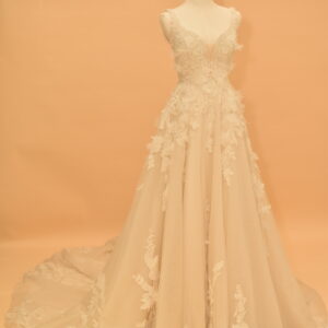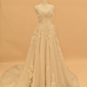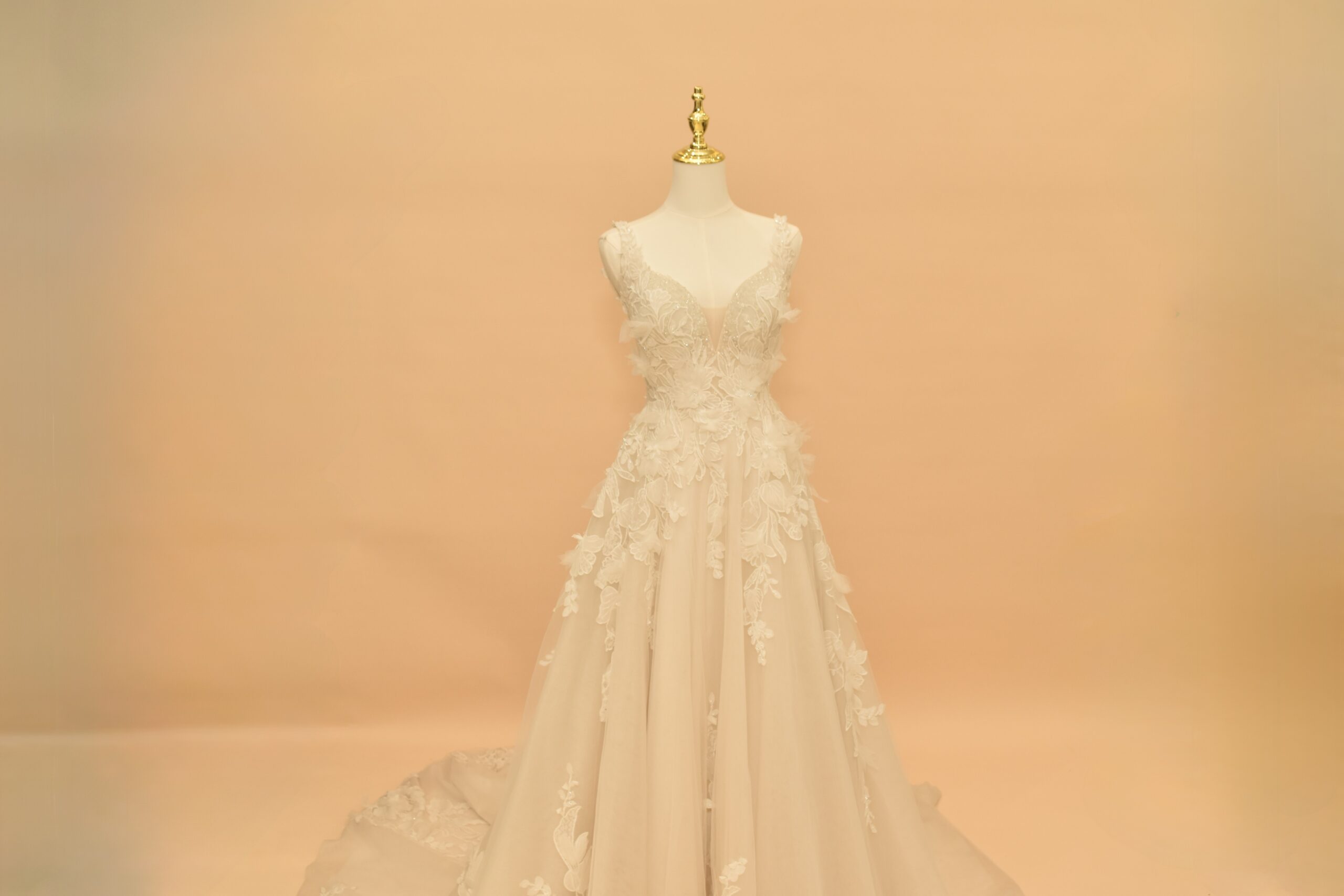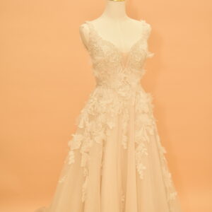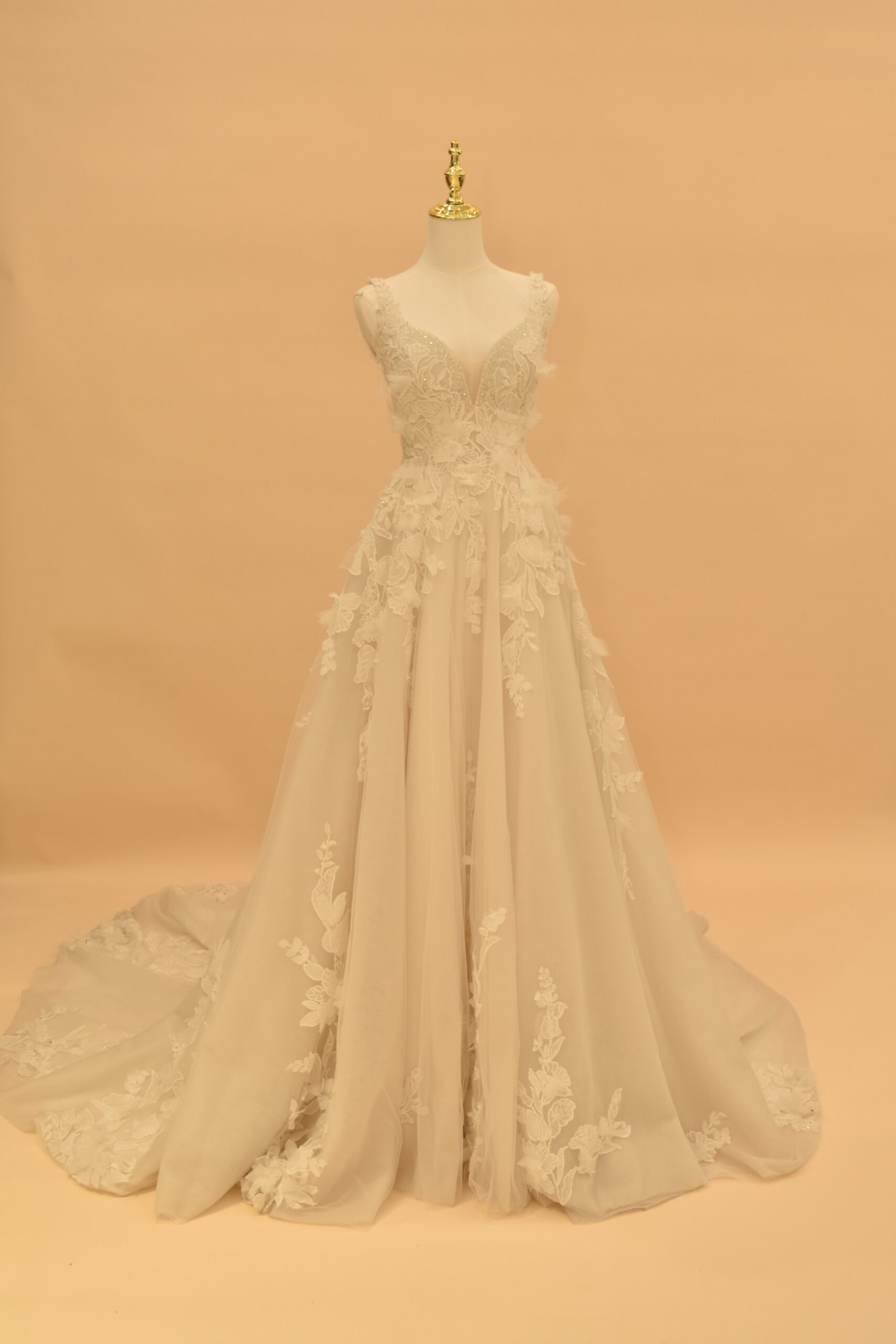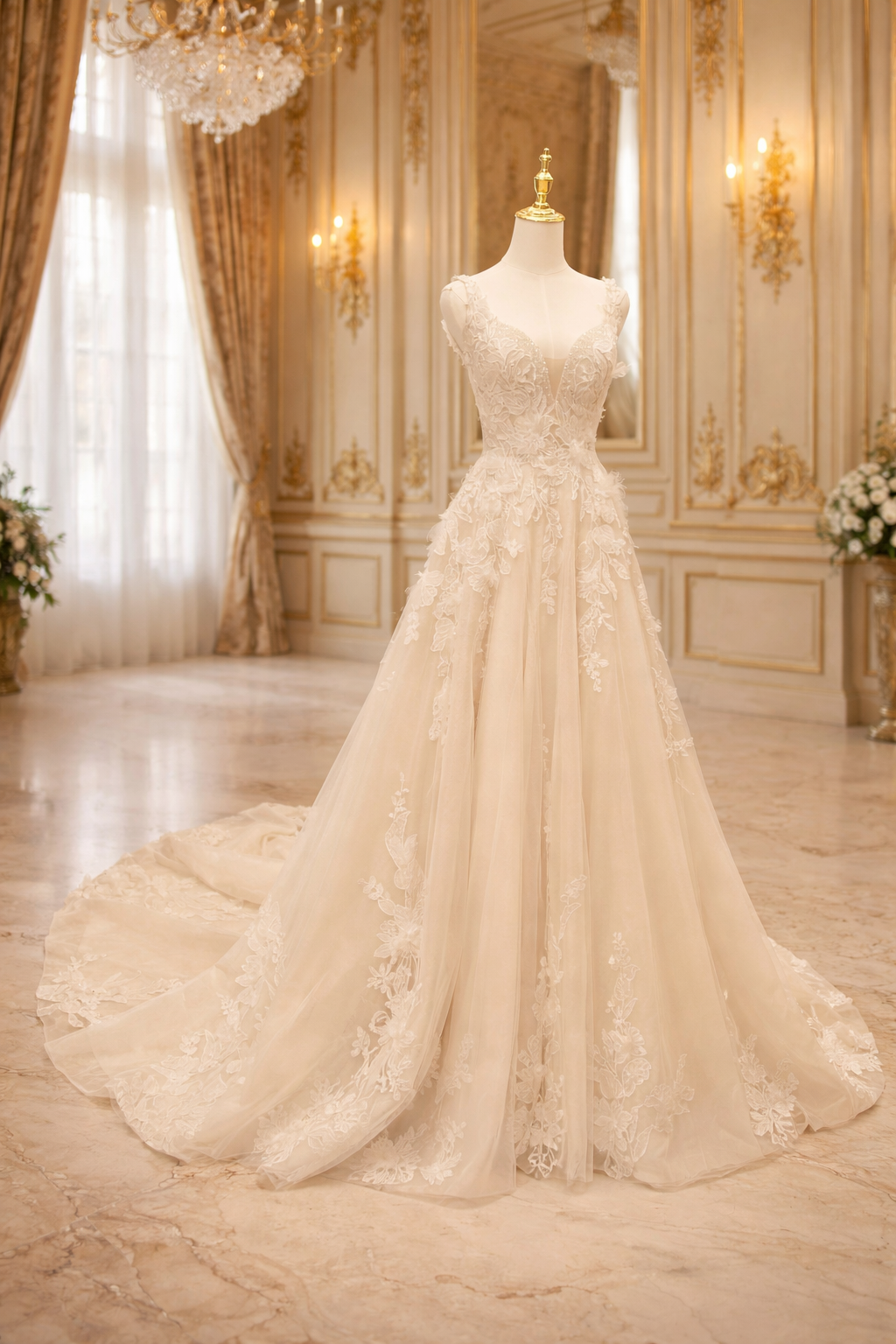 If the 3D floral detail on a V-neck gown is what draws you to Dahlia, the Ivory Deep V-Neck 3D Floral Lace Ball Gown offers the same floral construction in a fuller ball gown silhouette. For a tulle A-line with lace in a different neckline, the Romantic Off-Shoulder Lace Ball Gown is worth a look. To see Dahlia in person, book your private bridal appointment at our Sugar Land, TX boutique — we serve brides from Houston, Katy, Richmond, and Fort Bend County, with video consultations available for out-of-town clients.
