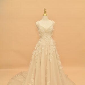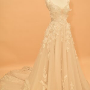 The back drops into a low open V, which is the most dramatic design element on the gown. A subtle lace-up closure sits within the open back, keeping the fit adjustable while staying visually minimal against the skin. The train is long and integrated into the skirt hem, extending from the back as a natural continuation of the tulle layers. The floral appliques are hand-finished individually — each petal is shaped and attached by hand rather than as a pre-made unit — which means the placement and texture vary slightly across the gown rather than repeating in a mechanical pattern.