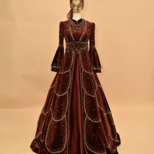 Hurrem is made to order according to your measurements. The bodice, sleeve tiers, and skirt length are all constructed to your specific sizing after your order is confirmed — not taken from a standard size and adjusted. The style, colour, and design remain exactly as shown. We confirm your production timeline after ordering and provide updates through each stage until the gown is ready for collection or shipping.