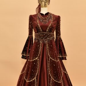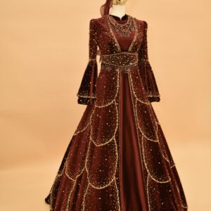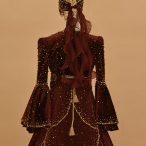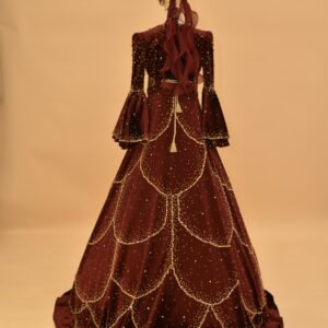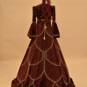 This majestic henna gown is crafted from luxurious burgundy velvet, embodying a regal and traditional aesthetic. The bodice features a striking deep-V illusion neckline layered over a satin-finish underlay, embellished with hand-applied gold crystals and beadwork. The dramatic bell sleeves are tiered and heavily detailed, adding a sense of grandeur and movement to the silhouette.