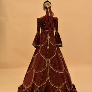 Hurrem is a henna night gown made from deep burgundy velvet – a fabric that photographs richly and holds its colour under both warm indoor lighting and flash. The bodice features a deep-V illusion neckline over a satin-finish underlay, with hand-applied gold crystals and beadwork covering the surface. The bell sleeves are tiered in two sections – each tier is finished separately and carries its own beading — which gives the sleeves their weight and movement as you raise and lower your arms. This is a gown designed for a seated ceremony as much as for standing photographs: the silhouette reads clearly and the detail holds up at close range.