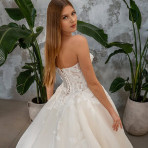 The voluminous ball gown skirt is adorned with delicate, hand-placed floral lace appliqués that cascade beautifully from the bodice to the hemline, creating a soft and dreamy effect. The light ivory tone brings a natural glow, complementing all skin tones and adding a luxurious touch to the overall design.