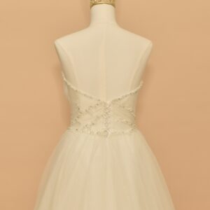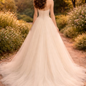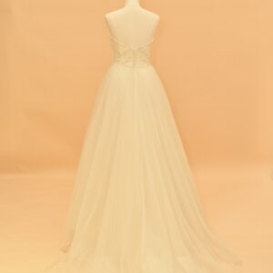 Lyra is a strapless A-line bridal gown with a sweetheart neckline and a beaded bodice. The beadwork is hand-stitched in a vine-like pattern using crystals and pearls, which runs across the torso and draws attention to the waist. The pattern is open rather than fully saturated — it sits against the fabric rather than covering it — which keeps the bodice light in weight while still catching light from multiple angles. Below the waist, the skirt opens into a full A-line shape made from multiple layers of soft, lightweight tulle. The tulle layers are stacked to create volume without stiffness, so the skirt moves freely with each step and holds its shape without a heavy petticoat underneath.