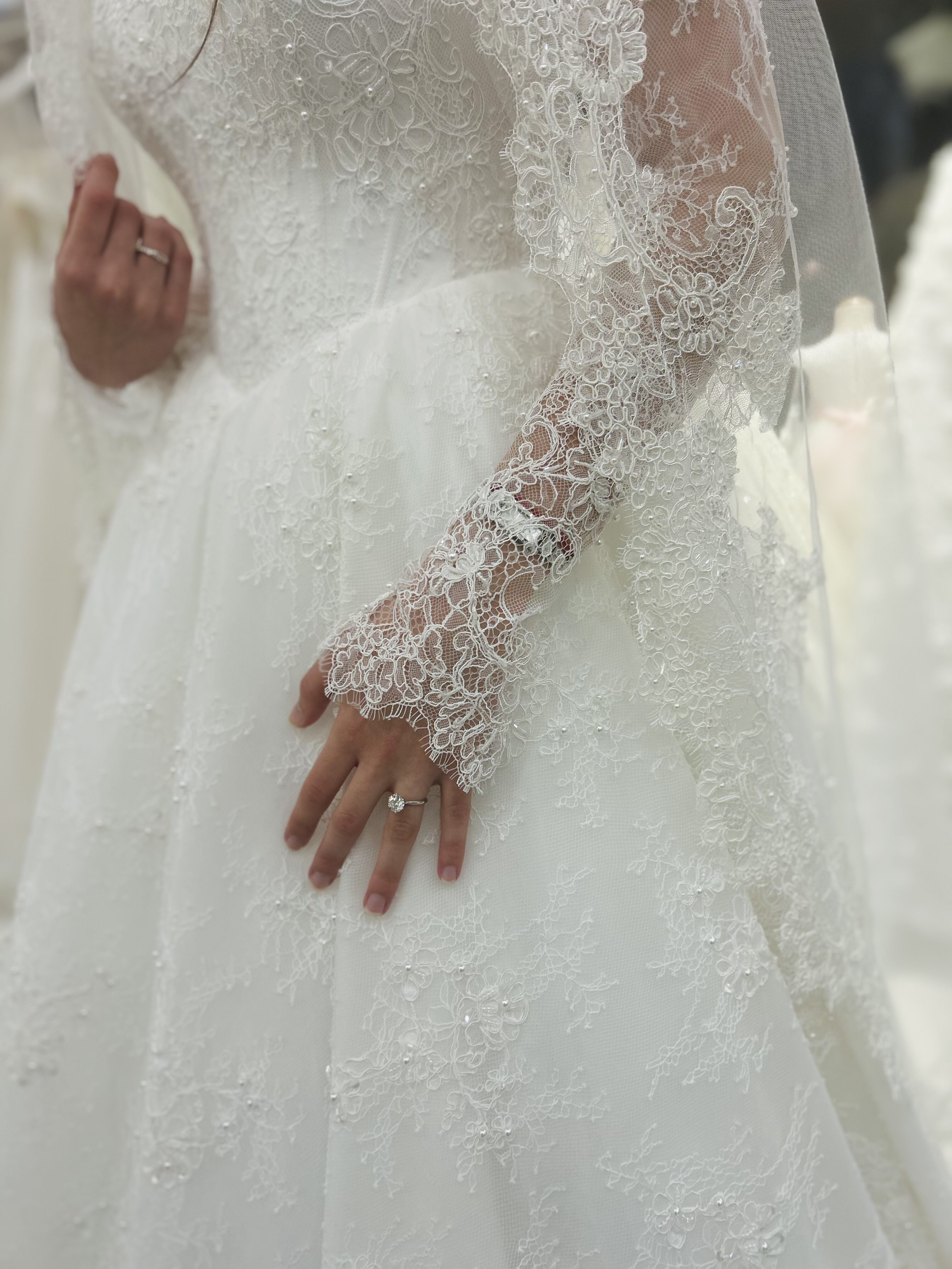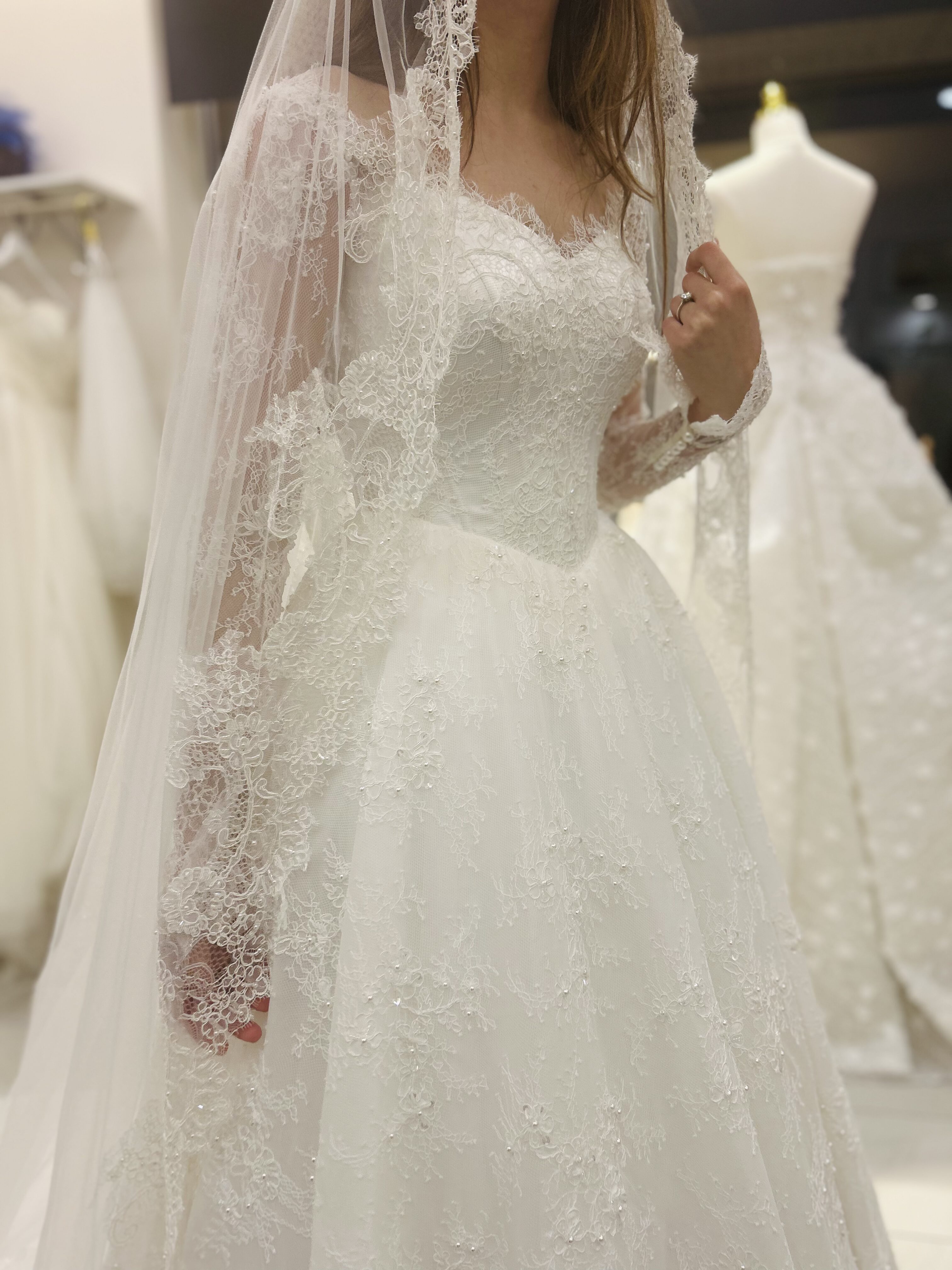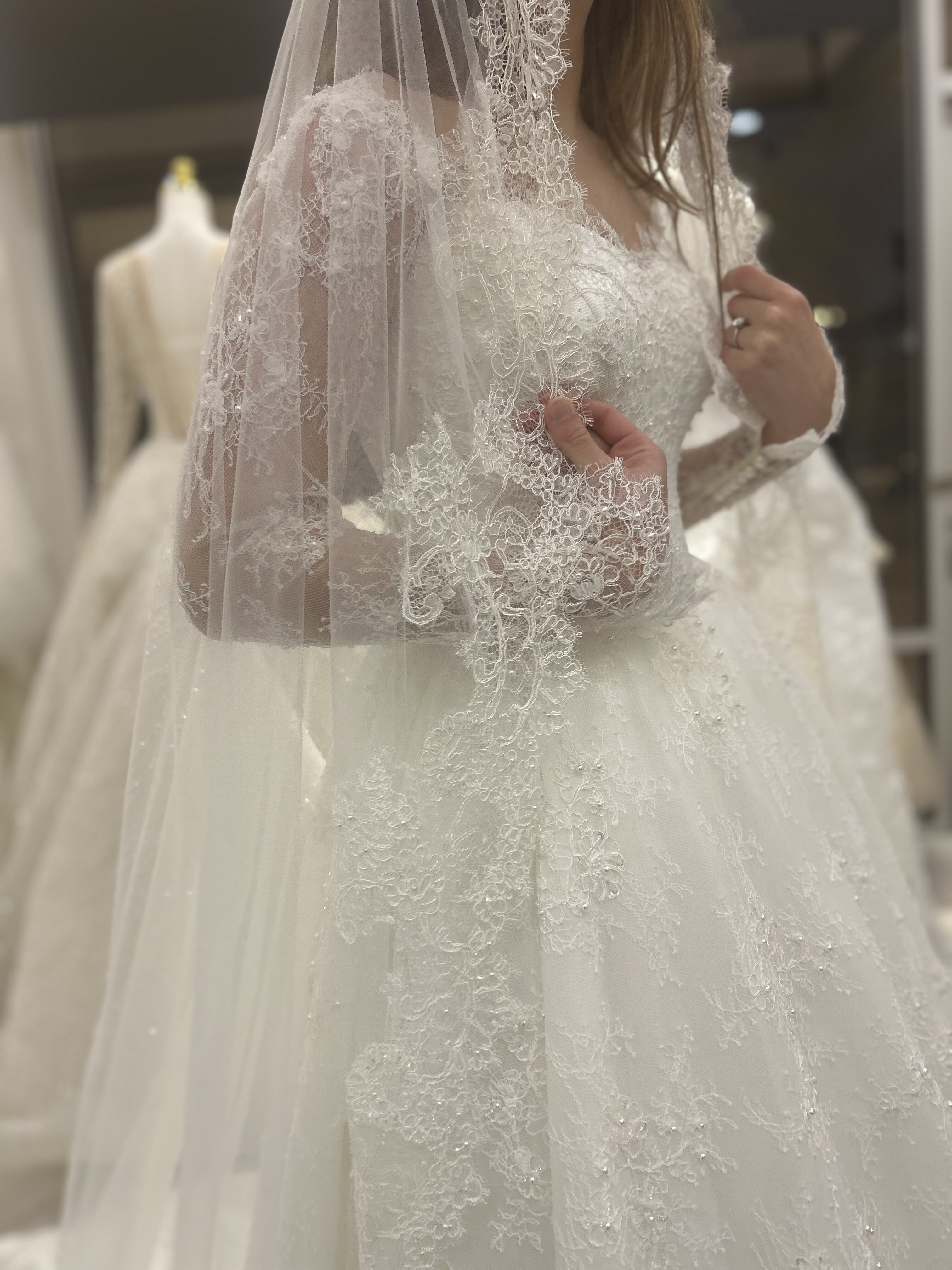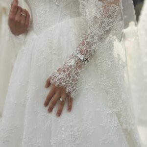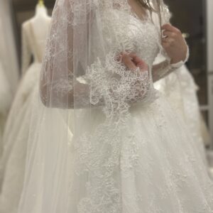 The long lace sleeves provide a romantic, modest touch, while the flowing A-line skirt creates a regal and effortlessly elegant movement. The matching lace veil enhances the overall look, adding depth and harmony to the design.