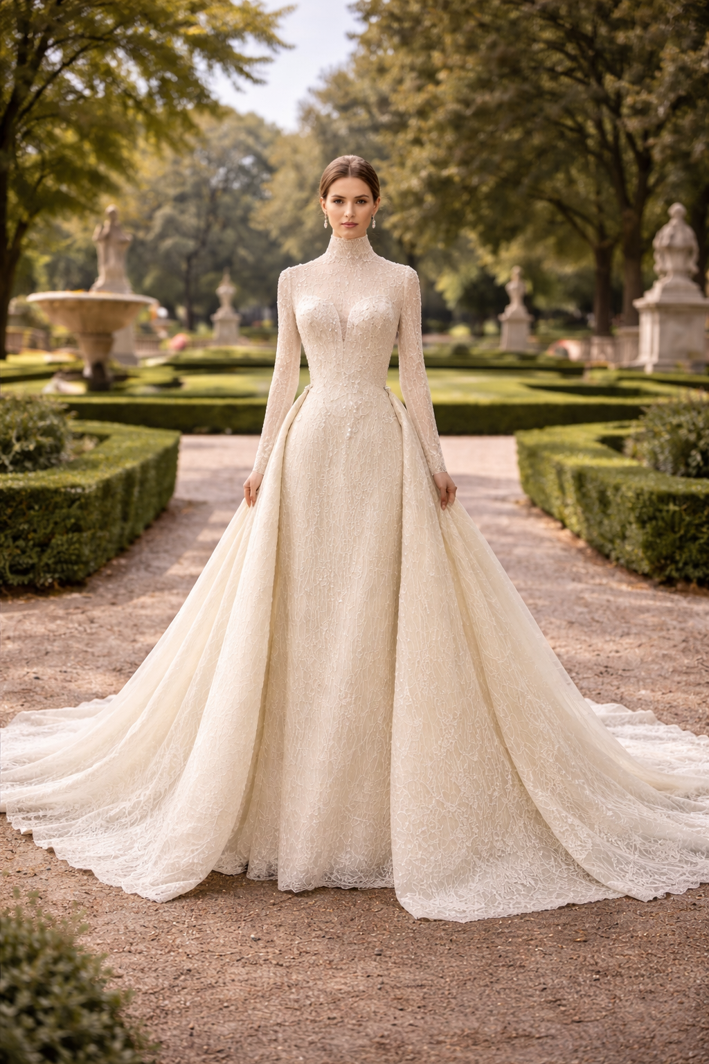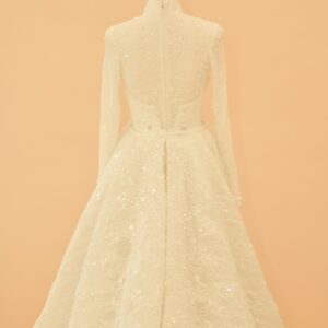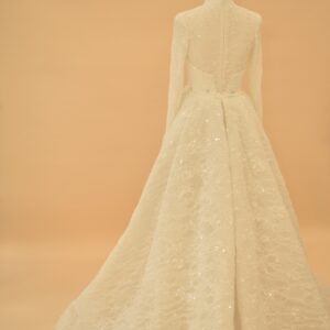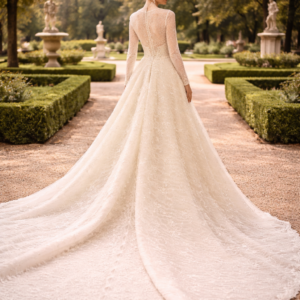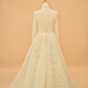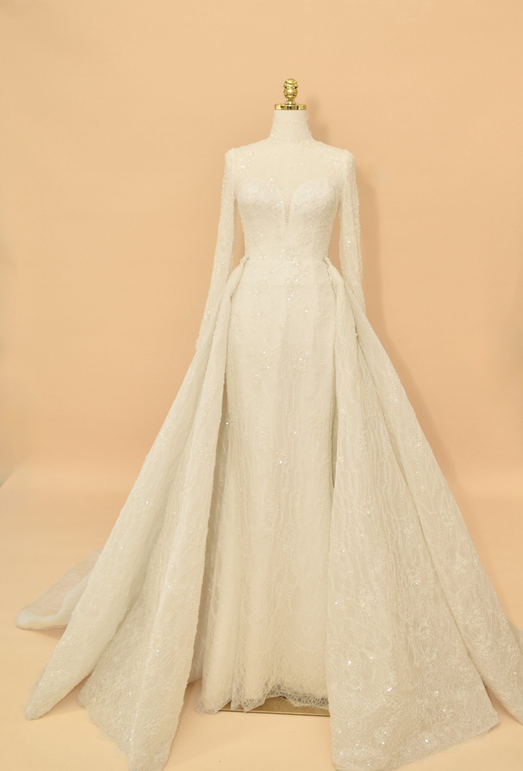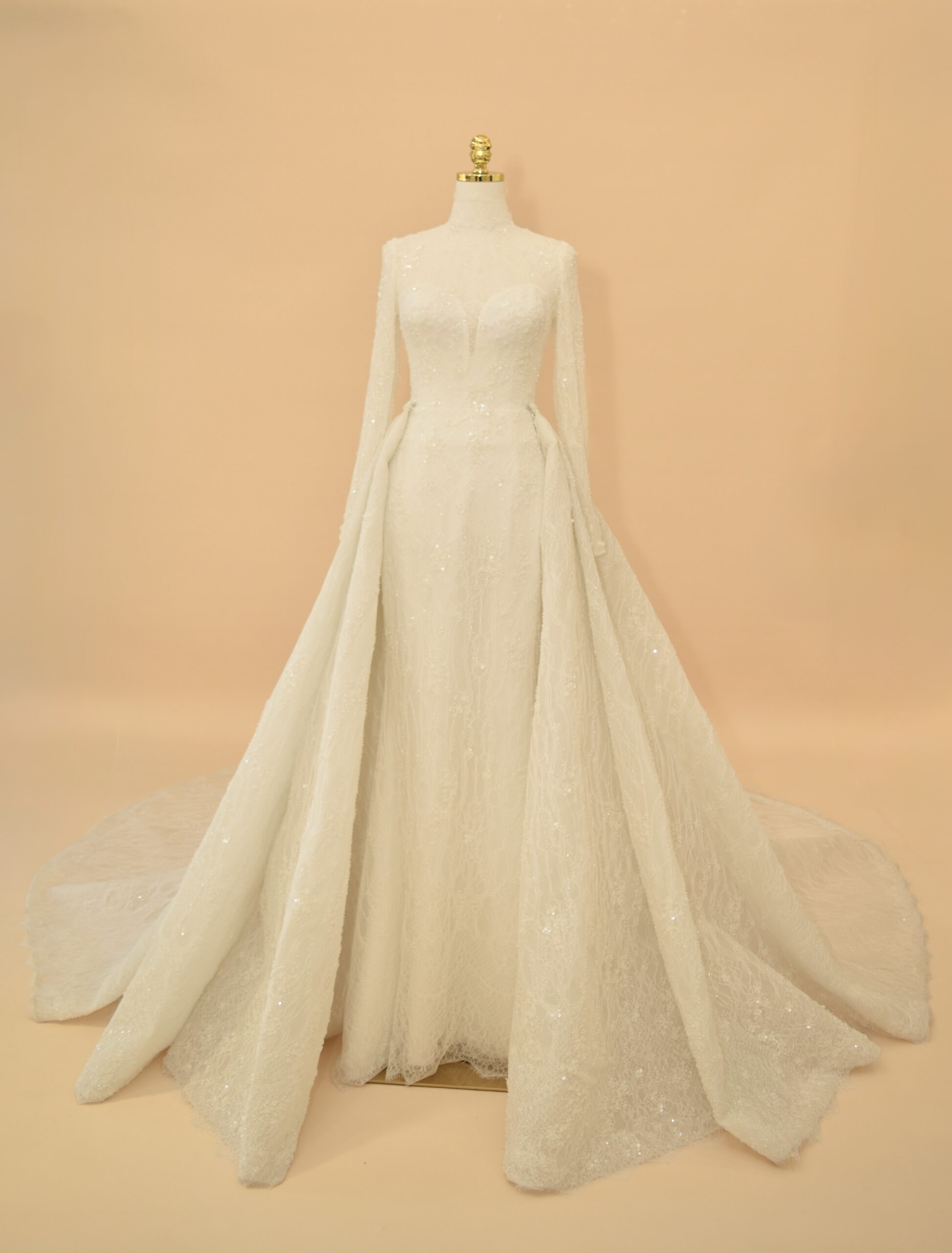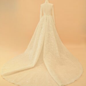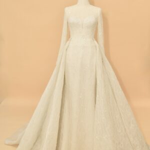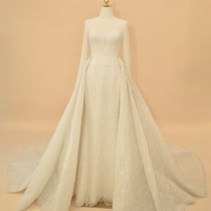 This sophisticated bridal gown features a high-neck illusion neckline and elegant long sleeves, meticulously crafted from shimmering European lace. The mermaid silhouette is designed to hug the body’s natural curves, transitioning into a delicate lace-trimmed hem. For a versatile bridal look, the gown includes a voluminous, detachable cathedral-length over-skirt that adds dramatic scale and a majestic train for the ceremony.