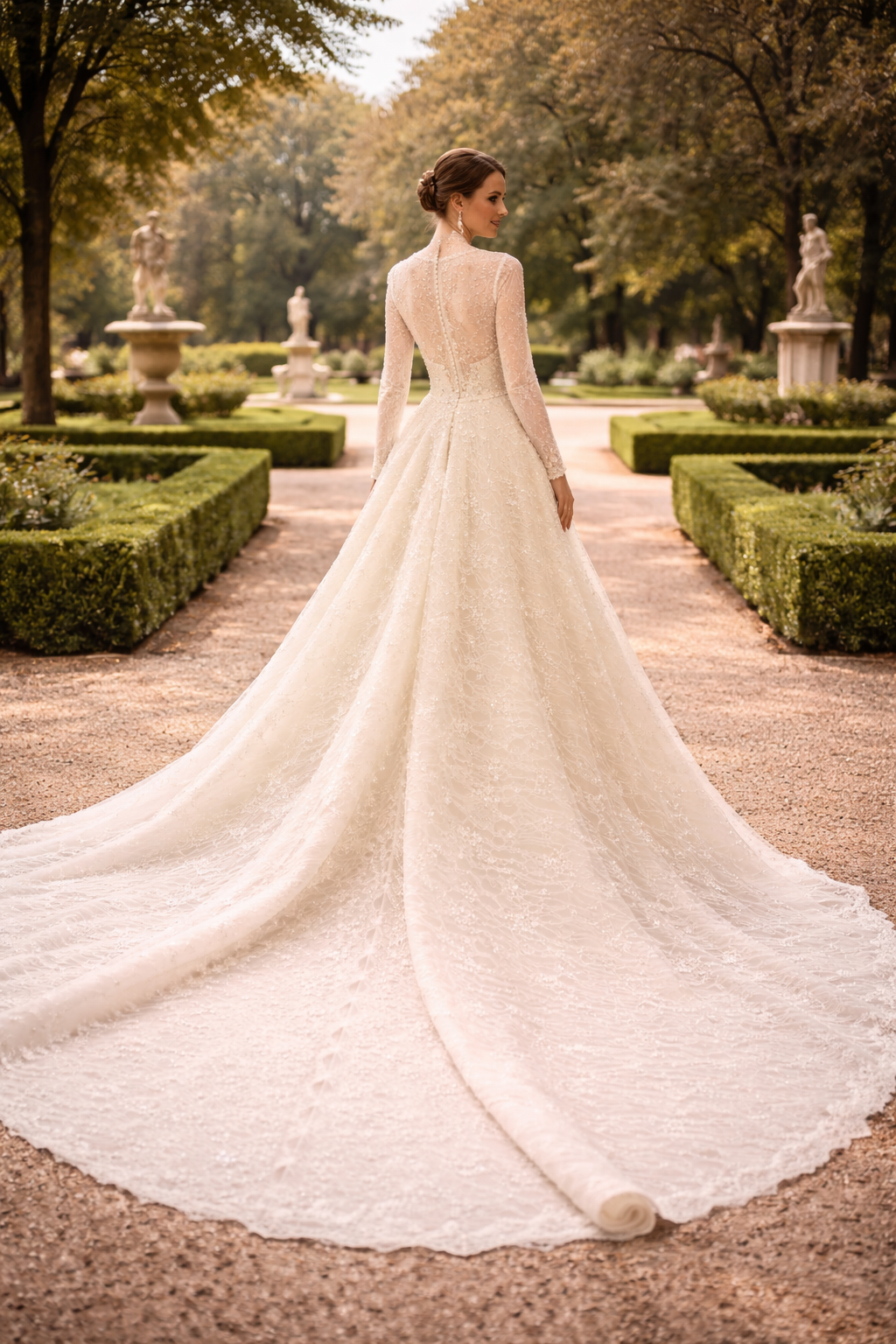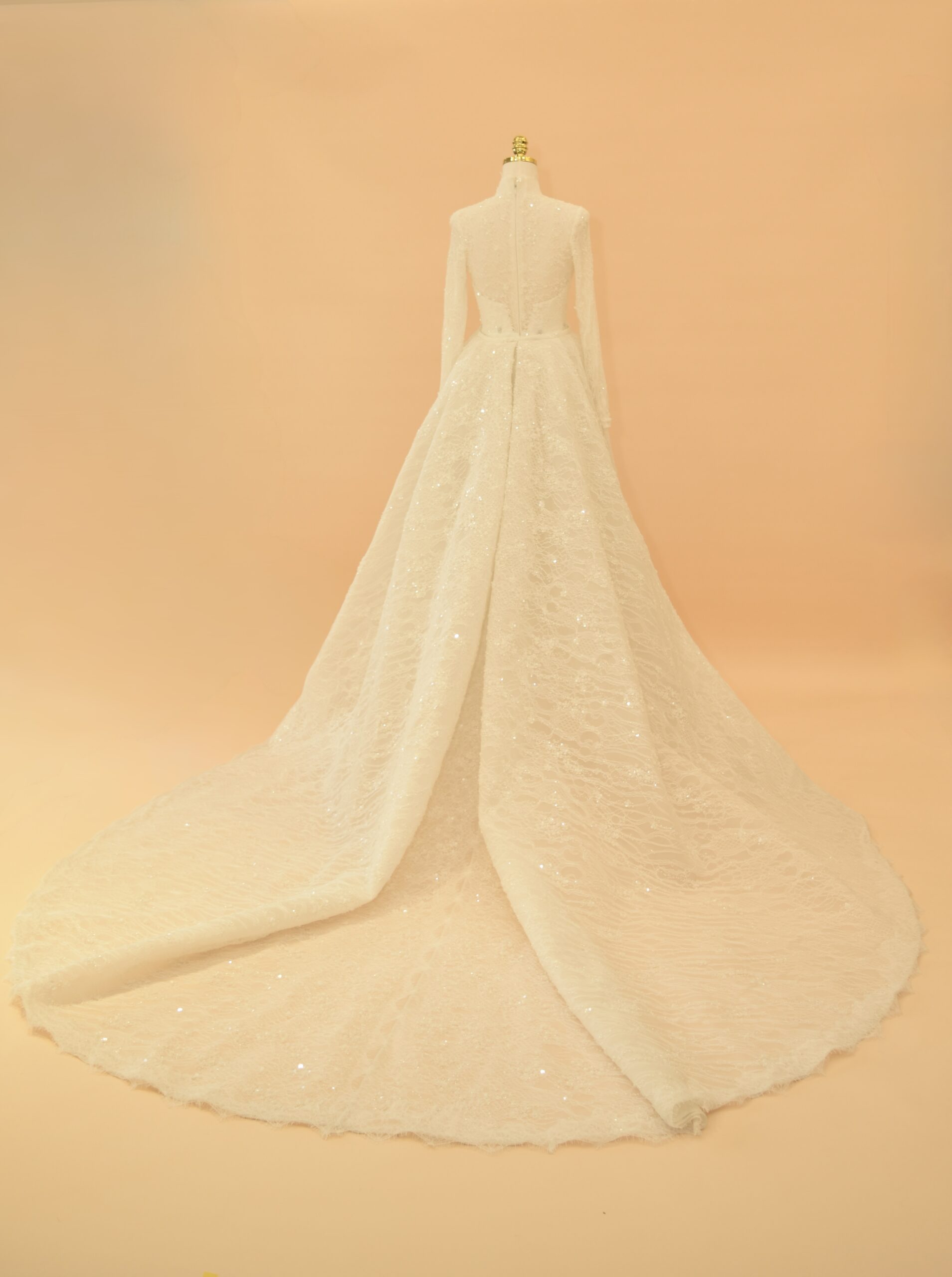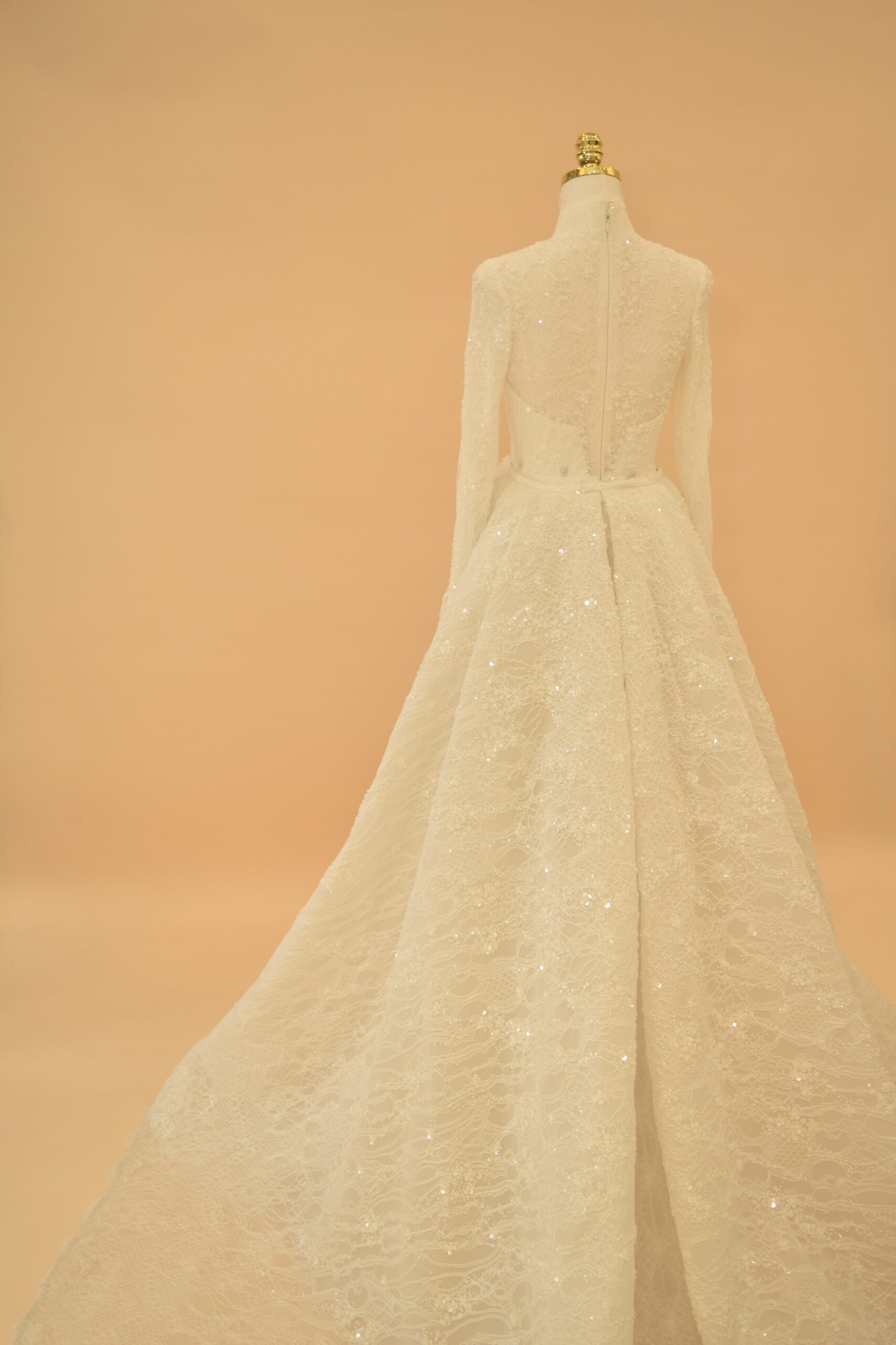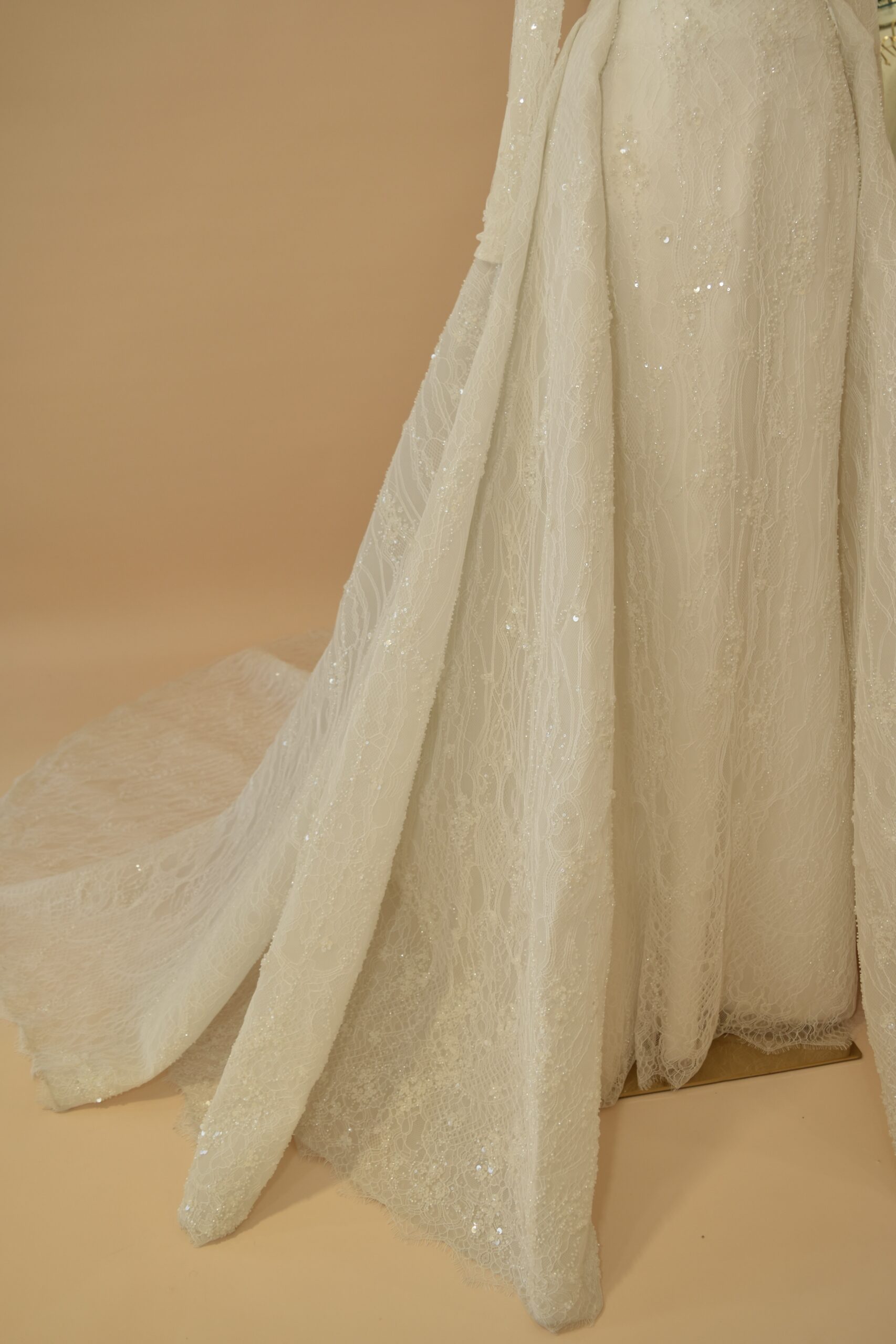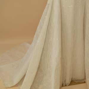 The back closes with a clean zipper concealed beneath a high-coverage lace panel, keeping the rear silhouette as sleek as the front. Across the gown, subtle sequins are woven into the lace fabric and hand-finished motifs sit at key points along the bodice and sleeves — details that catch light naturally without overpowering the overall line. The detachable cathedral-length over-skirt is the gown’s most practical feature: it attaches at the waist to add a full, dramatic train for the ceremony, then removes cleanly for the reception, leaving the fitted mermaid silhouette underneath.