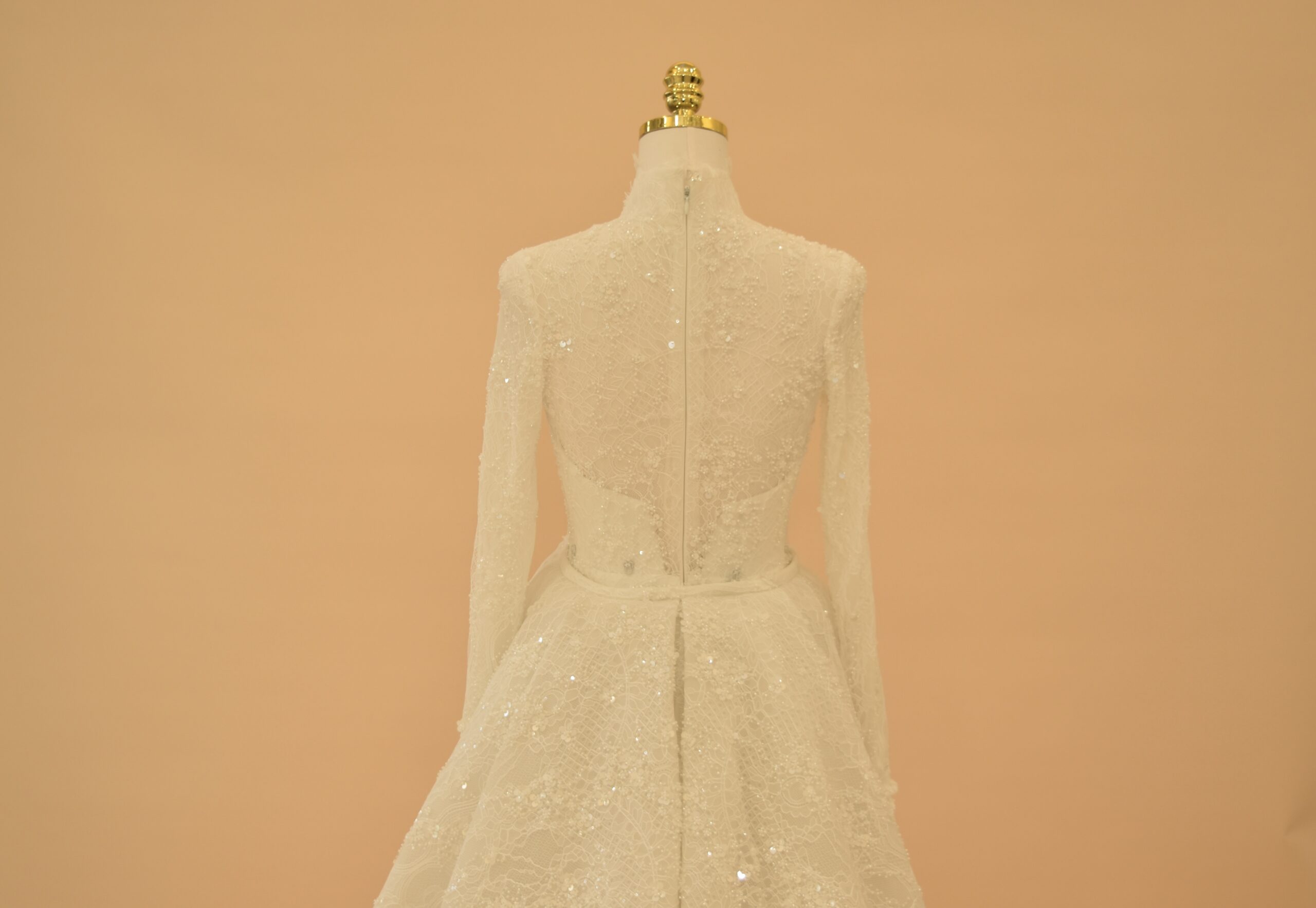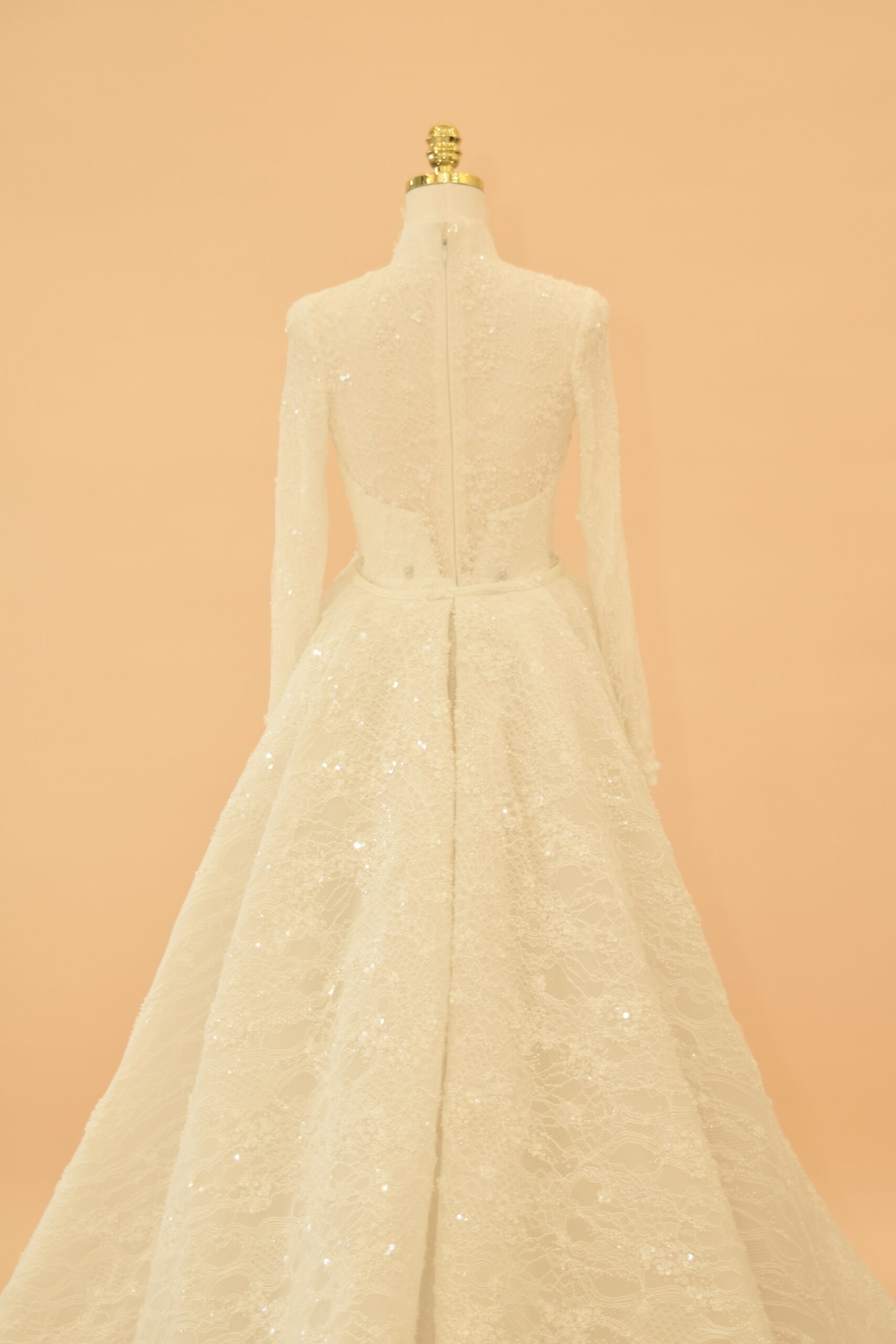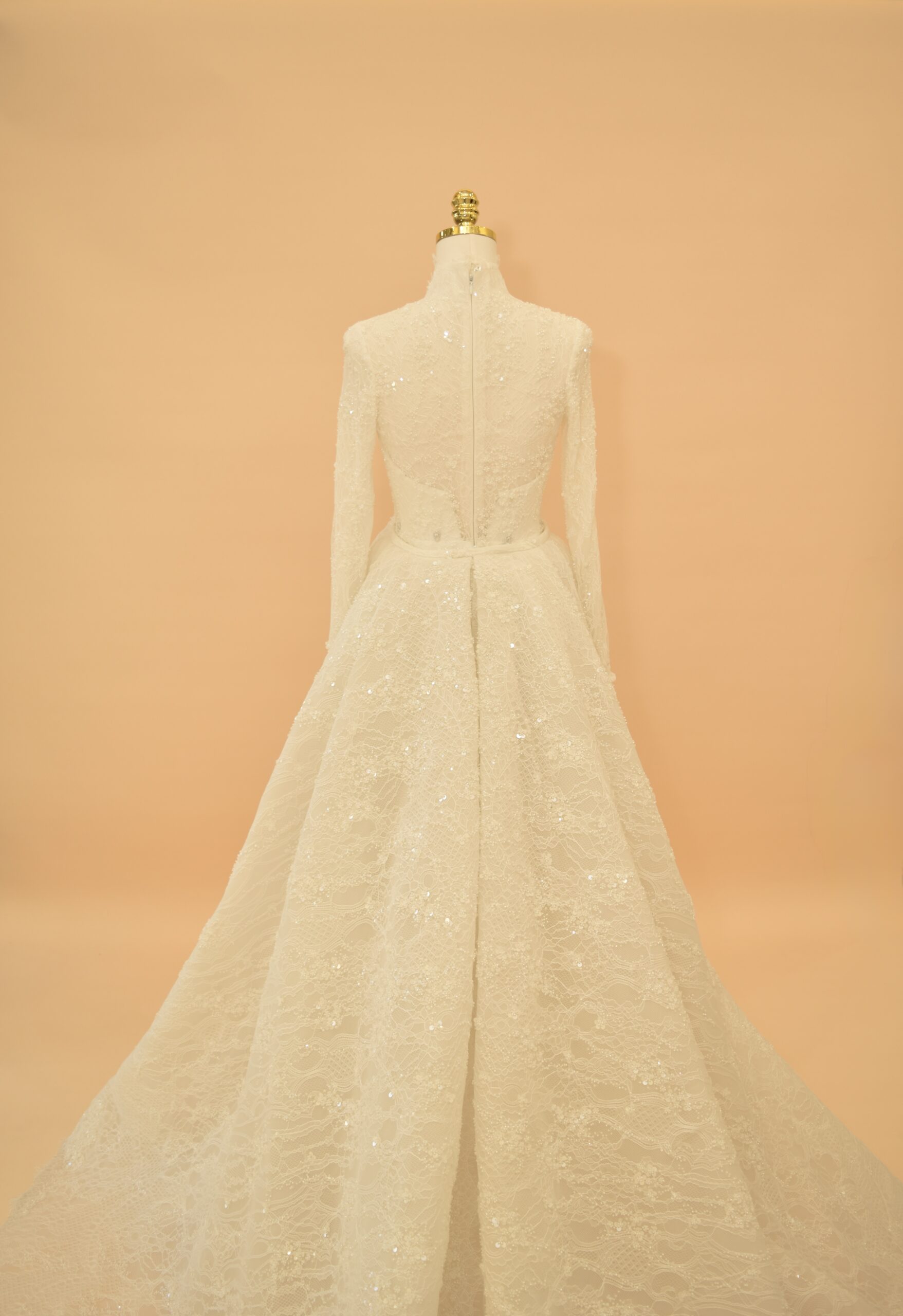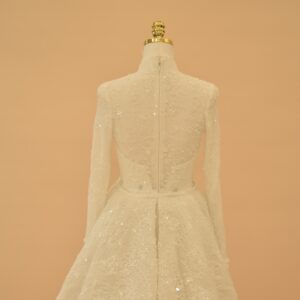 The back of the gown features a seamless zipper closure and a high-coverage lace design that maintains a sleek, polished aesthetic. Embellished with subtle sequins and hand-finished lace motifs, this two-piece ensemble offers a seamless transition from a grand, traditional aisle walk to a modern, form-fitting reception style, blending classic modesty with contemporary luxury.