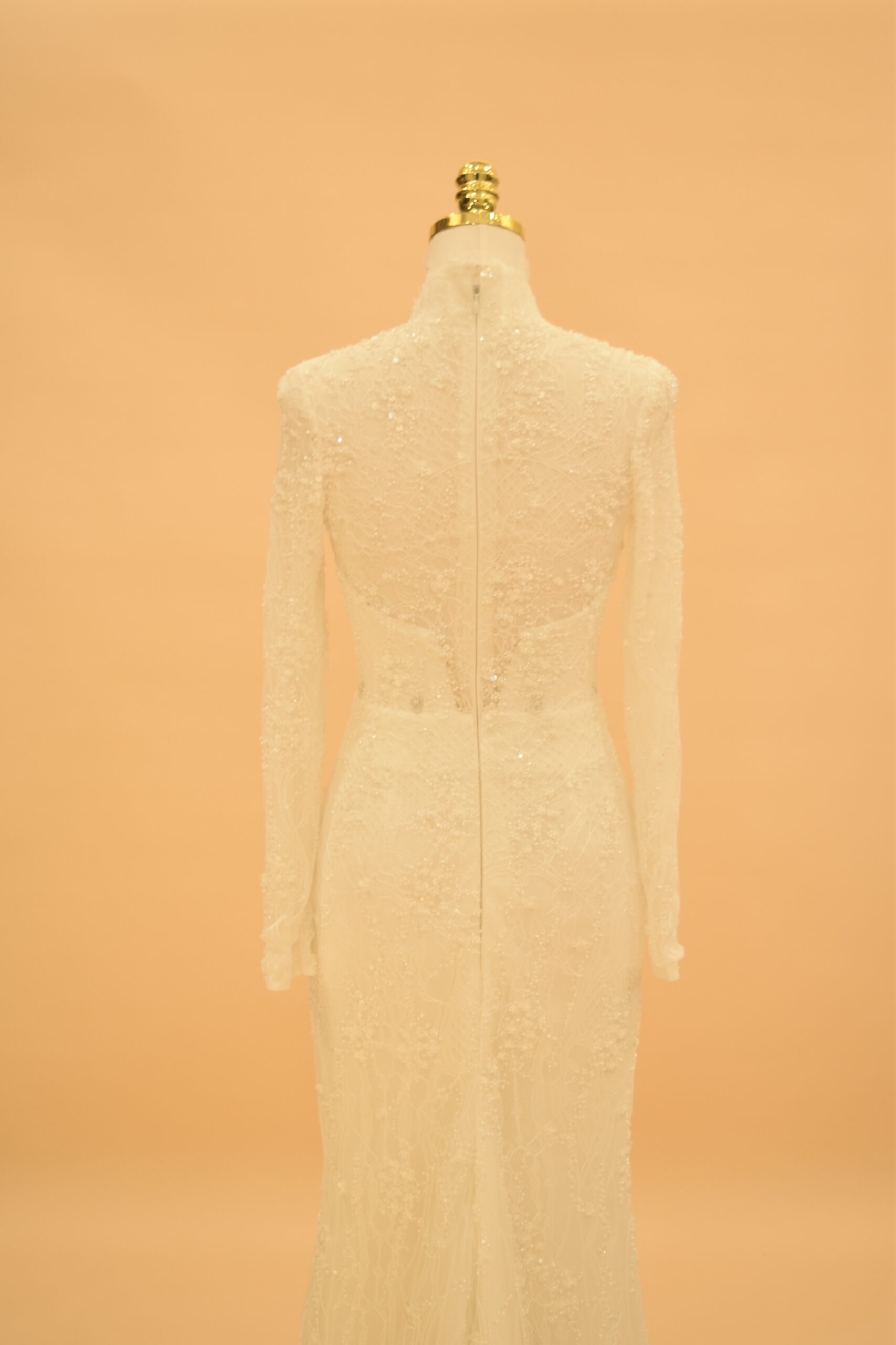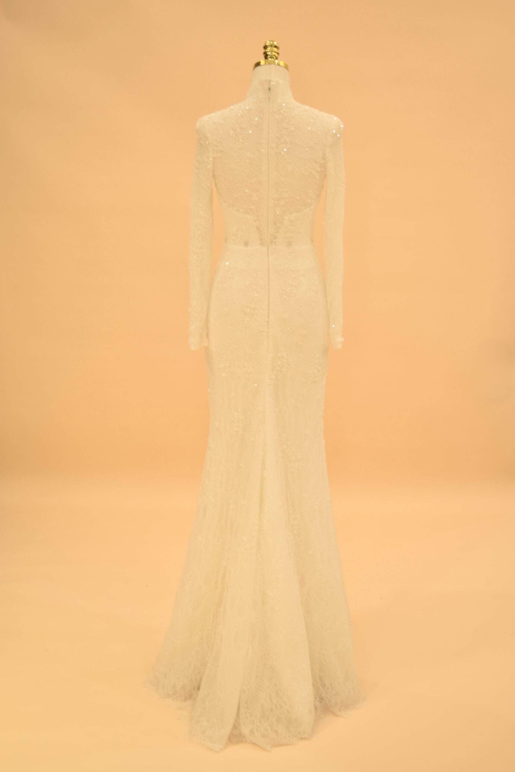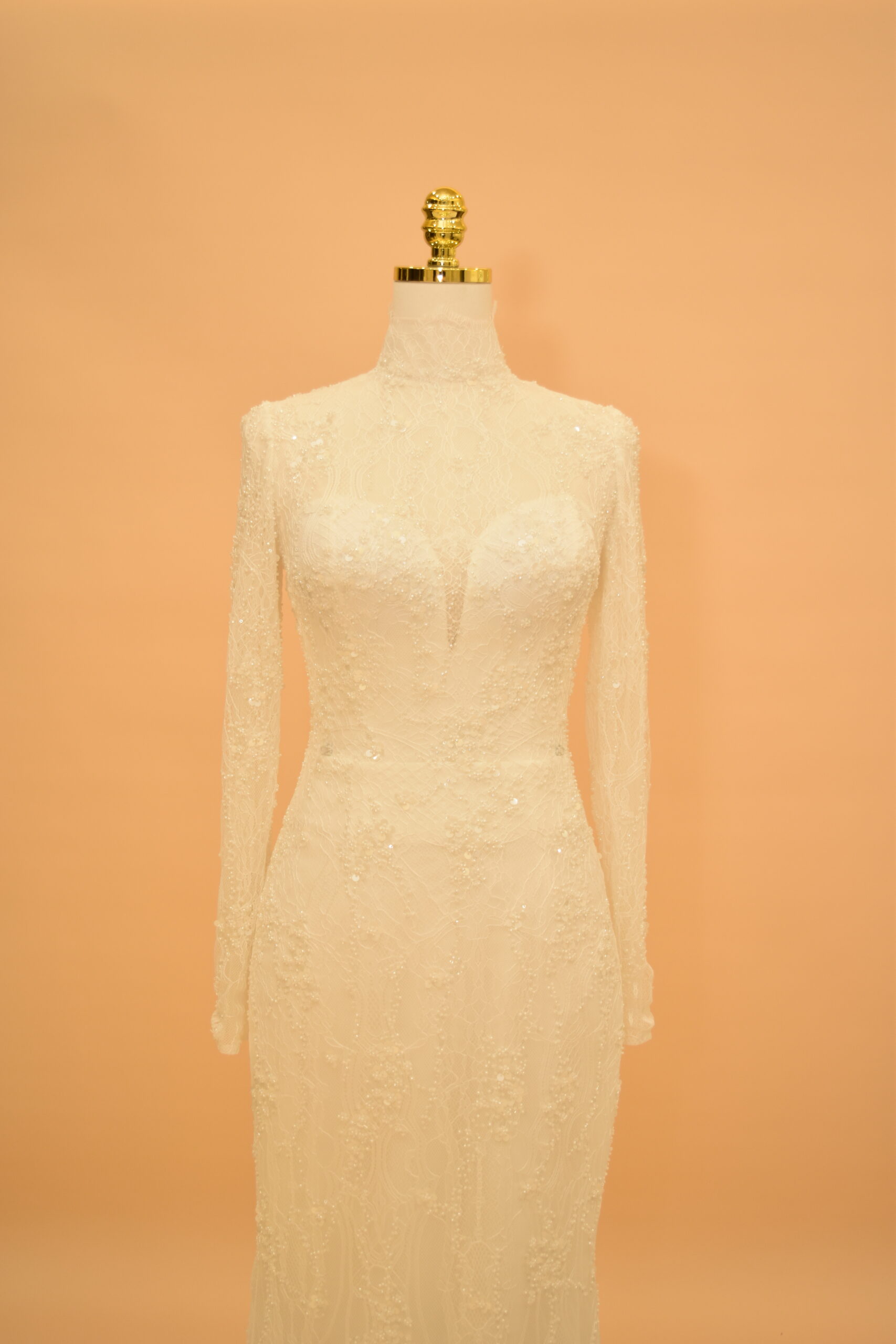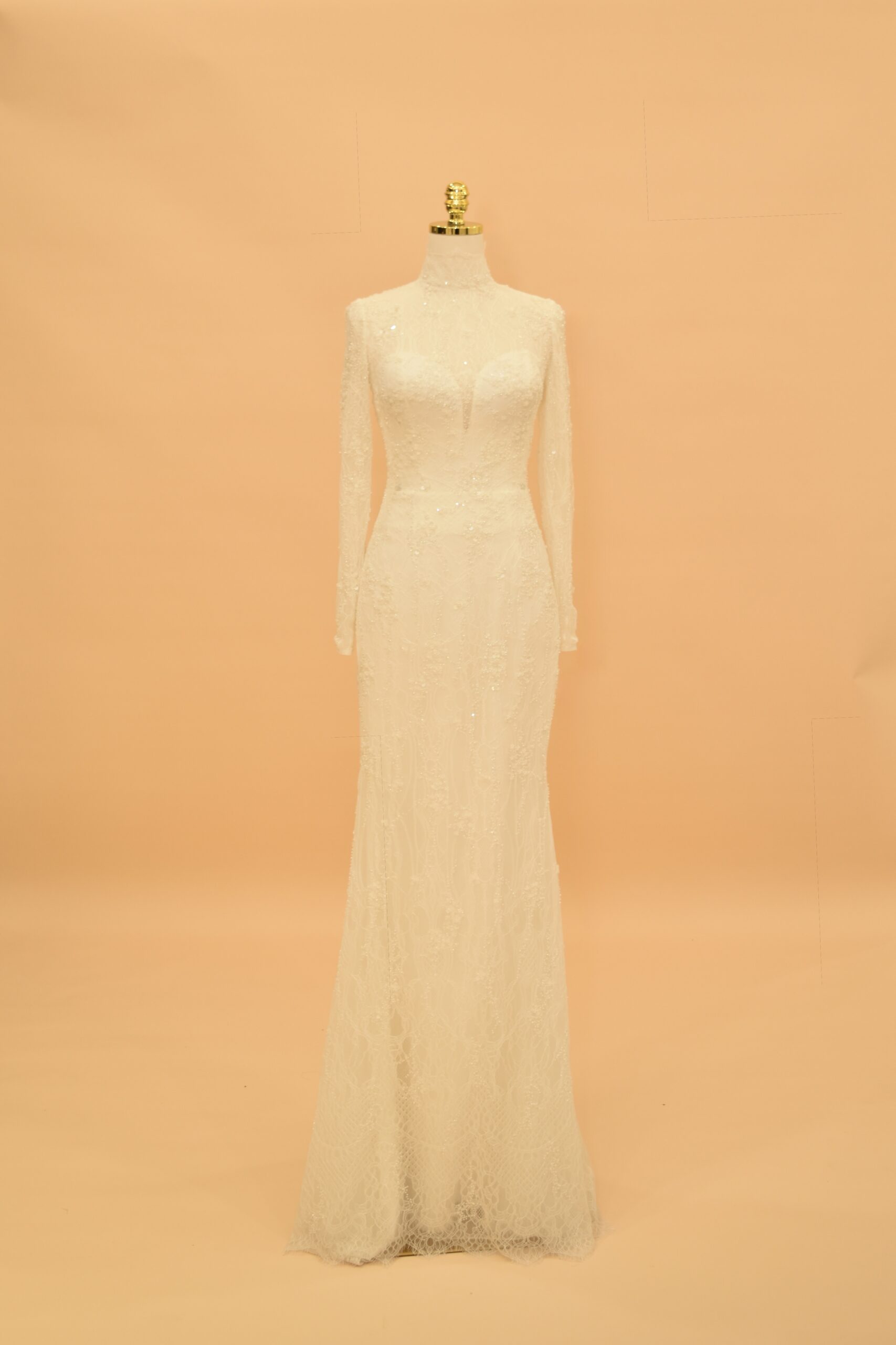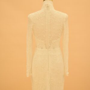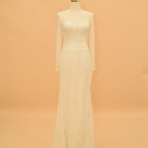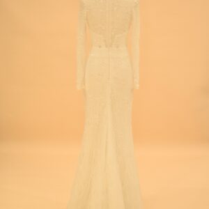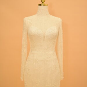 Seraphina is a mermaid bridal gown built on a high-neck illusion neckline and full-length sleeves, made from shimmering European lace throughout. The silhouette follows the body’s natural lines from the bodice through to the hips, then opens into a lace-trimmed hem at the floor. It is a gown designed for brides who want close-fitted structure without sacrificing coverage — the high neck and long sleeves give it a polished, modest look that photographs well from every angle.
