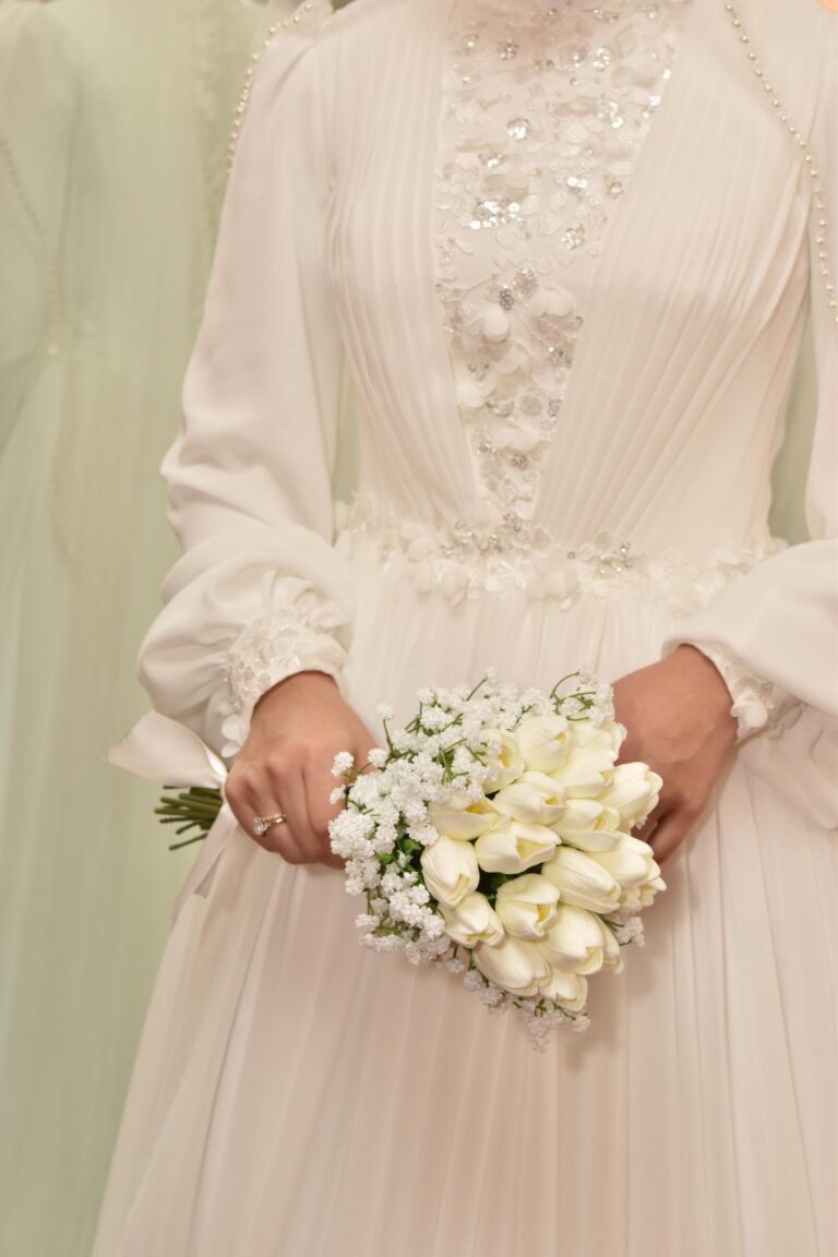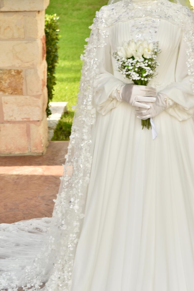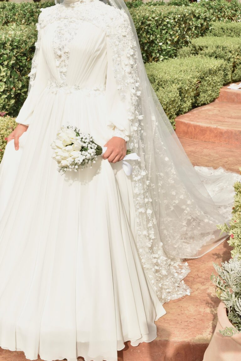 This elegant white dress, with its flowing A-line silhouette and delicate floral details, is crafted entirely to your unique measurements. The high-neck bodice with long sleeves ensures both comfort and sophistication, while the lace-adorned veil adds a romantic finishing touch. Every detail is made-to-measure, creating a truly one-of-a-kind gown for your most special day.