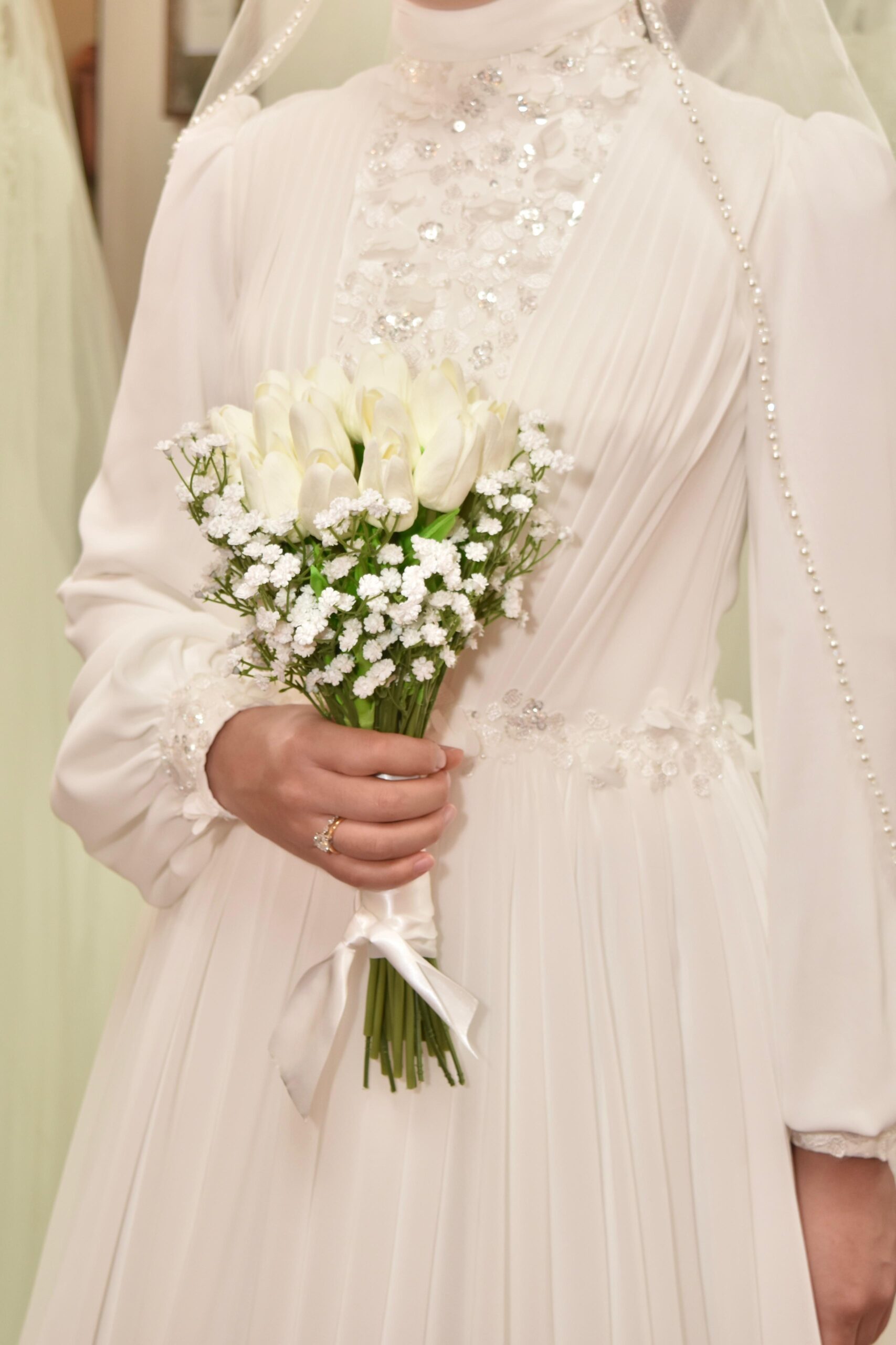 This elegant white dress, with its flowing A-line silhouette and delicate floral details, is crafted entirely to your unique measurements. The high-neck bodice with long sleeves ensures both comfort and sophistication, while the lace-adorned veil adds a romantic finishing touch. Every detail is made-to-measure, creating a truly one-of-a-kind gown for your most special day.