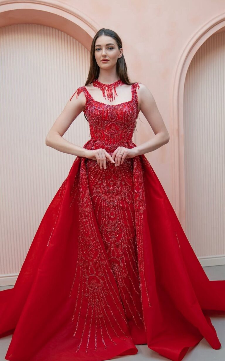 A gown that embodies power, passion, and royal elegance. This radiant red masterpiece stuns with its hand-applied beadwork, intricate embroidery, and a silhouette designed to command attention. The fitted bodice enhances the figure, while the detachable overskirt adds dramatic volume and regal flair—perfect for brides, special occasions, or anyone desiring a grand entrance.