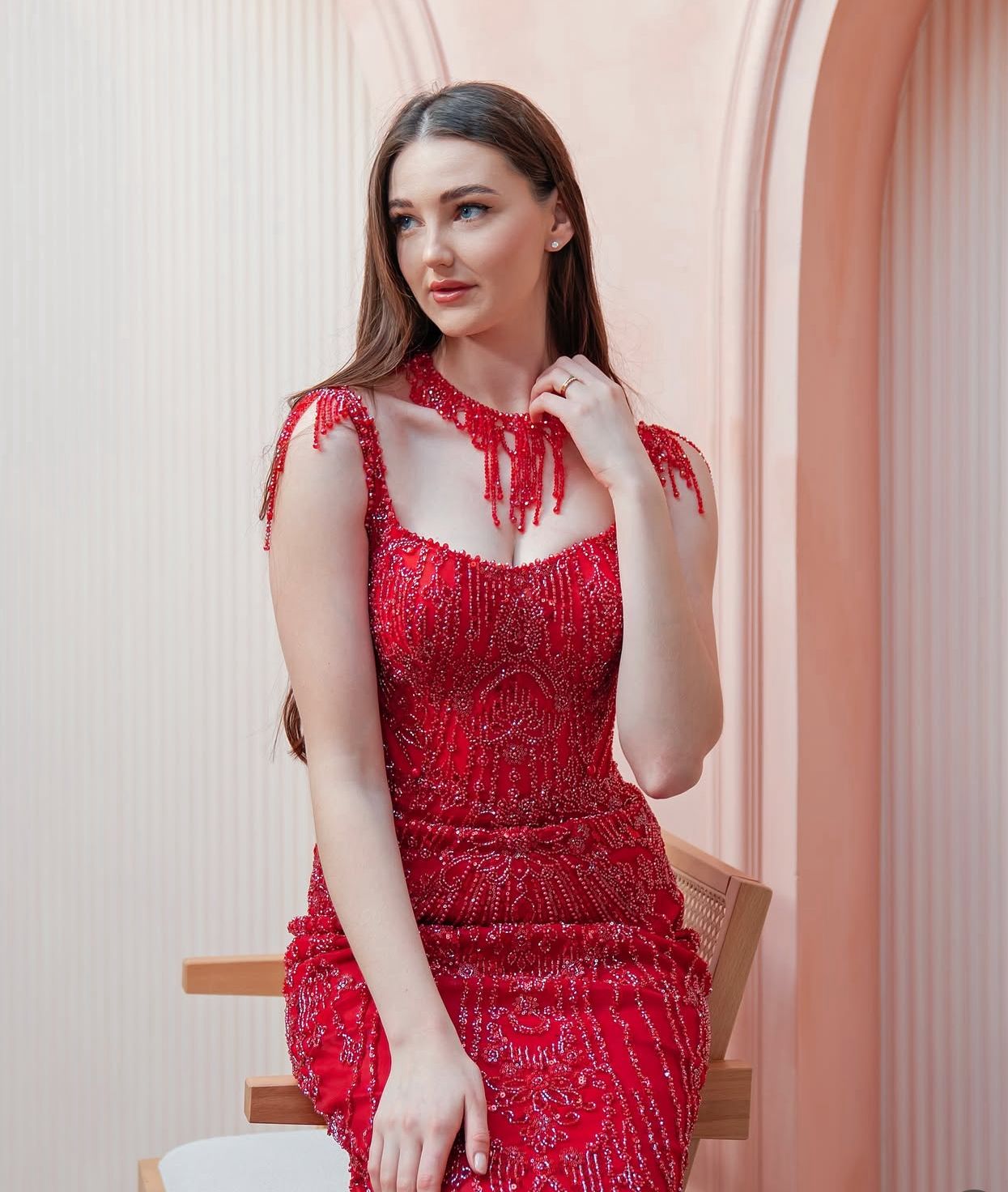 A gown that embodies power, passion, and royal elegance. This radiant red masterpiece stuns with its hand-applied beadwork, intricate embroidery, and a silhouette designed to command attention. The fitted bodice enhances the figure, while the detachable overskirt adds dramatic volume and regal flair—perfect for brides, special occasions, or anyone desiring a grand entrance.